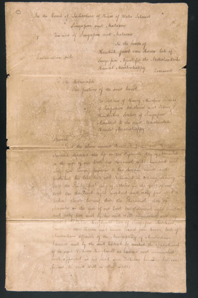 These are the warrant to act and the petition issued by Henry Minchin Simons and Petrus Hendrikus Socters concerning the administration of the goods of Kendrick Jacob van Hooru. They are part of a collection of legal documents from the 19th and early 20th centuries which provides a glimpse into the work of the notable personalities who left their mark on Singapore’s legal history, and the economic and other transactions undertaken by ordinary immigrants in 19th century Singapore that tell stories of misfortune and indebtedness which would otherwise have disappeared from history.