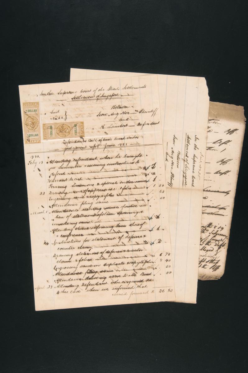 This is a document dated 16 December 1880 detailing the employment of Rudolph Lambert by Seow Ang Hee. It concerns the suit between Seow (plaintiff) and Lambert (defendant). It is part of a collection of legal documents from the 19th and early 20th centuries which provides a glimpse into the work of the notable personalities who left their mark on Singapore’s legal history, and the economic and other transactions undertaken by ordinary immigrants in 19th century Singapore that tell stories of misfortune and indebtedness which would otherwise have disappeared from history.