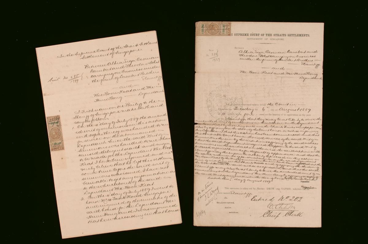 This is a set of documents concerning the suit between Tay Siew Teaw and others (plaintiffs), and Chea Geak Koon and Taw Sock Unn (defendants). It is part of a collection of legal documents from the 19th and early 20th centuries which provides a glimpse into the work of the notable personalities who left their mark on Singapore’s legal history, and the economic and other transactions undertaken by ordinary immigrants in 19th century Singapore that tell stories of misfortune and indebtedness which would otherwise have disappeared from history.