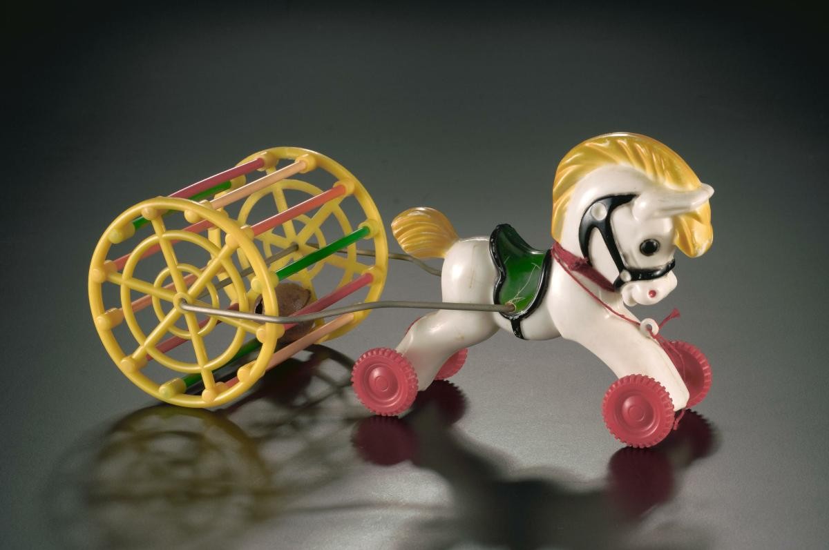 This is a rainbow-coloured baby toy roller with bells that was commonly found in households in the 1960s.