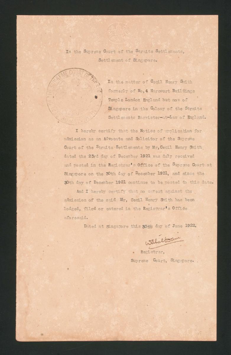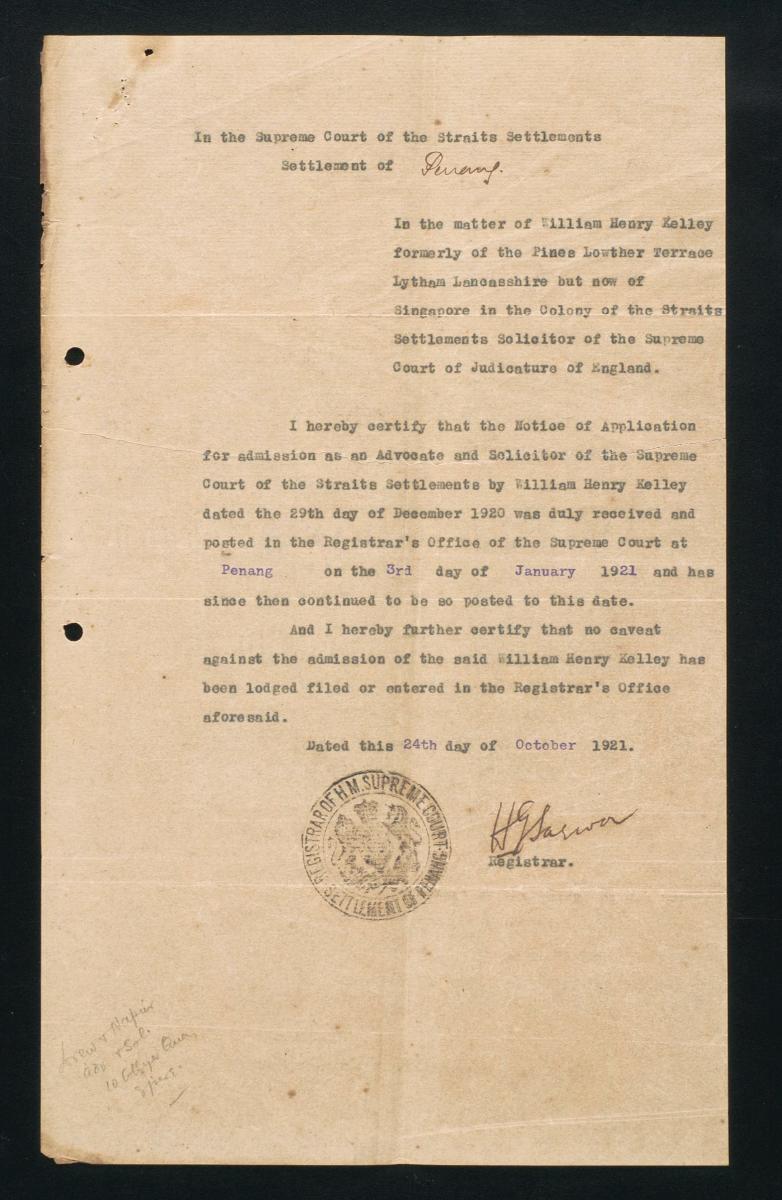 This is a registrar's certificate issued on 20 October 1921 by the Registrar of the Supreme Court of the Straits Settlements in Singapore for William Henry Kelley. It is part of a collection of legal documents from the 19th and early 20th centuries which provides a glimpse into the work of the notable personalities who left their mark on Singapore’s legal history, and the economic and other transactions undertaken by ordinary immigrants in 19th century Singapore that tell stories of misfortune and indebtedness which would otherwise have disappeared from history.