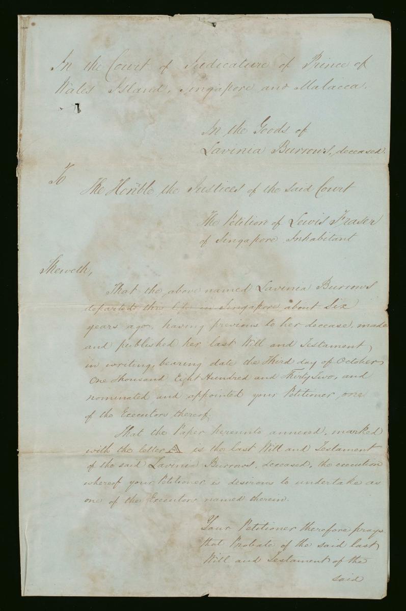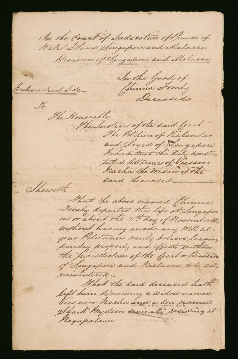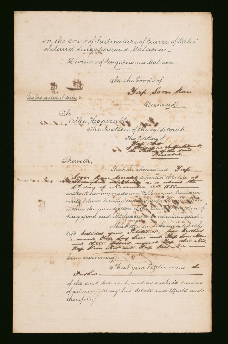 This is the petition of Rabaha of Singapore concerning the administration of the estate of the deceased Ti Tim. It is part of a collection of legal documents from the 19th and early 20th centuries which provides a glimpse into the work of the notable personalities who left their mark on Singapore’s legal history, and the economic and other transactions undertaken by ordinary immigrants in 19th century Singapore that tell stories of misfortune and indebtedness which would otherwise have disappeared from history.