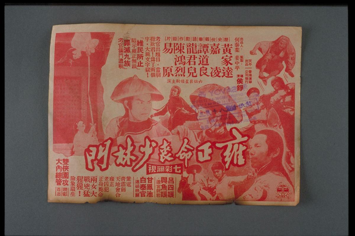 This poster was used to advertise the Mandarin movie, ‘The Invincible Blind Swordsman’ (盲侠破三关, Mangxiaposanguan), which was produced by Shaw Brothers and featured a Japanese cast.Between the 1950s and 1960s, most Mandarin, Cantonese and other Chinese-dialect movies were made in Hong Kong by film production companies with financial support from Singapore-based film studios such as Shaw Brothers, Cathay and Kong Ngee (光艺, Guanyi). These studios were also involved in the distribution and exhibition of these movies in Singapore and the rest of Southeast Asia through their network of cinemas. In the early 1970s, Mandarin movies from Taiwan became popular, but by the late 1970s, Hong Kong movies were dominant once more.