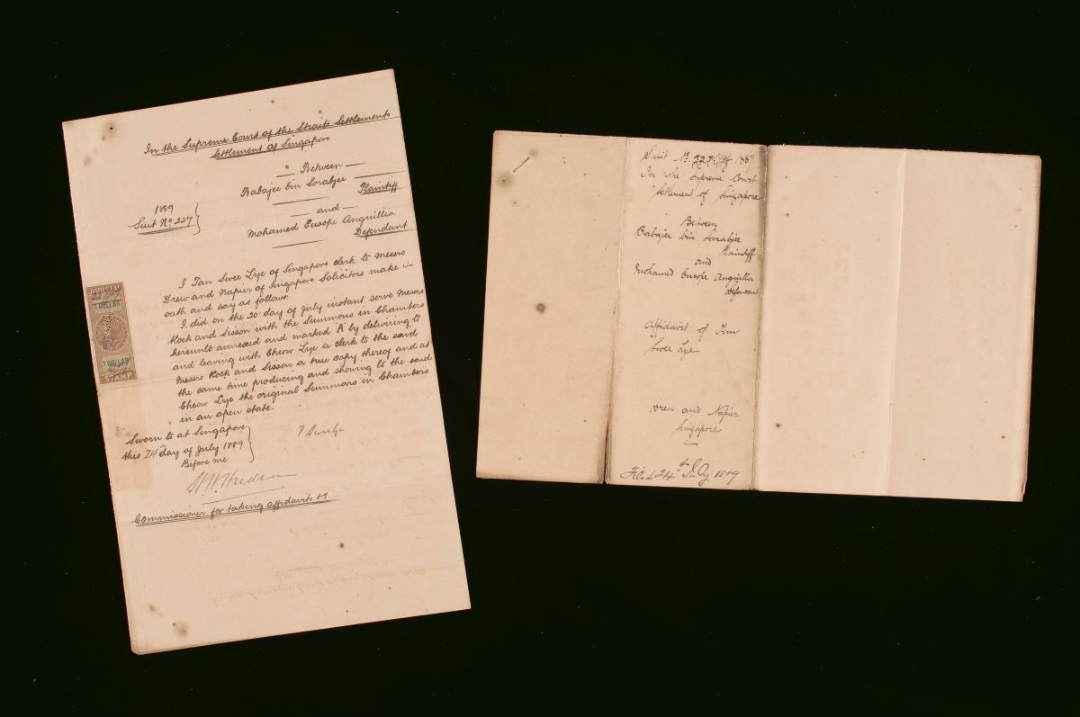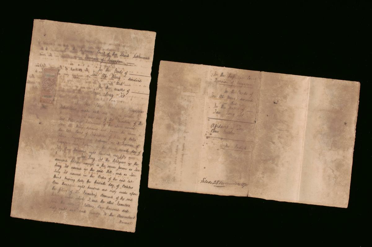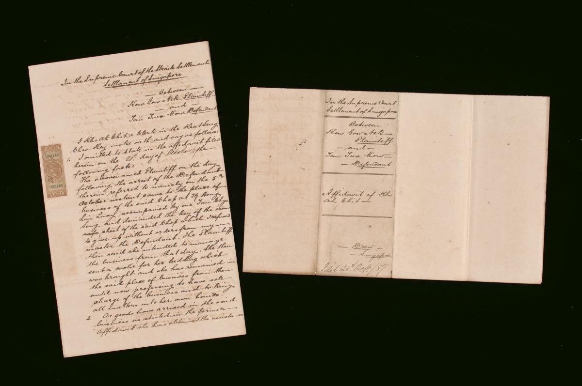This is the affidavit of Low Ah Swee made on 10 December 1883 concerning the administration of the estate of the deceased Low Ah Poey. It is part of a collection of legal documents from the 19th and early 20th centuries which provides a glimpse into the work of the notable personalities who left their mark on Singapore’s legal history, and the economic and other transactions undertaken by ordinary immigrants in 19th century Singapore that tell stories of misfortune and indebtedness which would otherwise have disappeared from history.