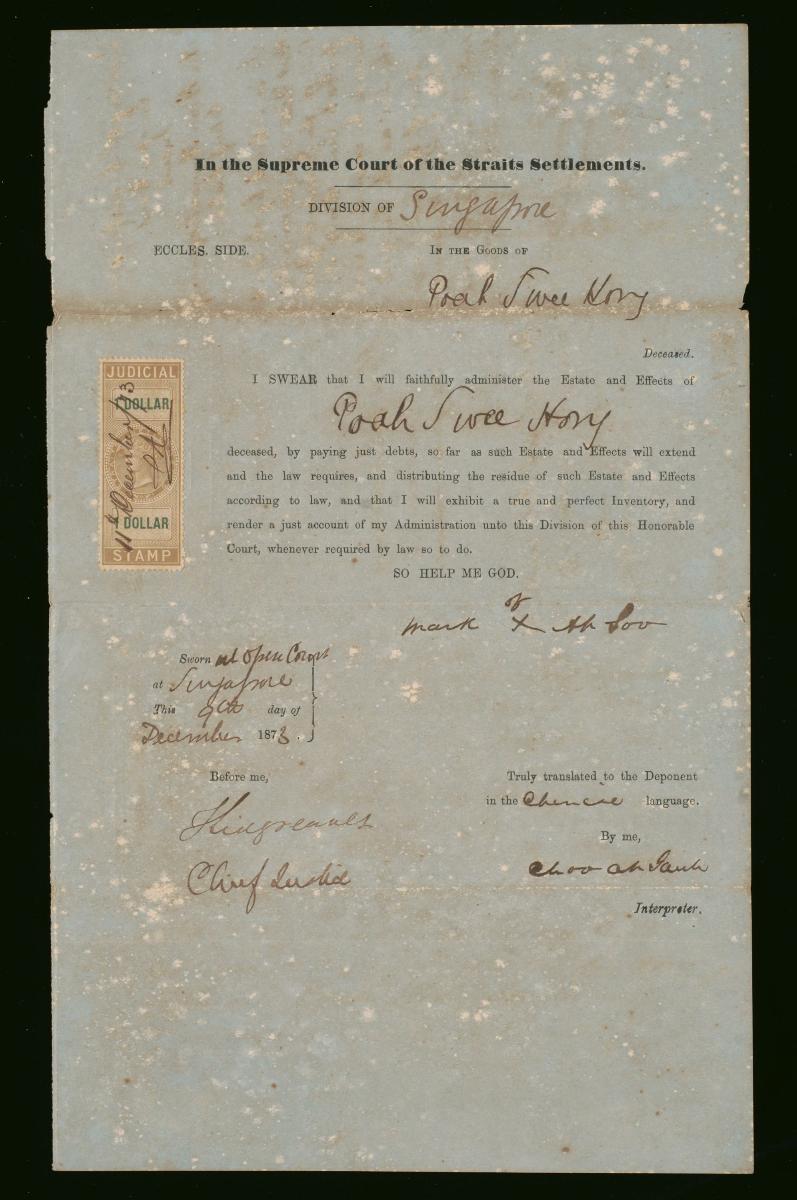 This is an oath sworn by Suat Oah on 25 April 1853 concerning the administration of the estate of Ng Lee Seng. It is part of a collection of legal documents from the 19th and early 20th centuries which provides a glimpse into the work of the notable personalities who left their mark on Singapore’s legal history, and the economic and other transactions undertaken by ordinary immigrants in 19th century Singapore that tell stories of misfortune and indebtedness which would otherwise have disappeared from history.