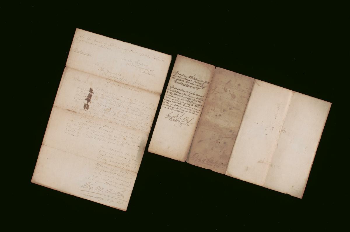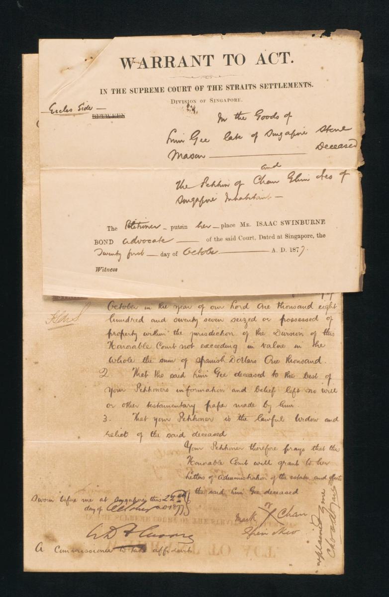 These are the petition and the warrant to act concerning the administration of the estate of the deceased Neo Team Lock. The petition was filed by Tan Cheng Yeang of Malacca and Neo Liong Kim Neo, the wife of the deceased. They also issued a warrant to act on 29 April 1867, which authorized Mr Edwin Koek to act on their behalf. These documents are part of a collection of legal documents from the 19th and early 20th centuries which provides a glimpse into the work of the notable personalities who left their mark on Singapore’s legal history, and the economic and other transactions undertaken by ordinary immigrants in 19th century Singapore that tell stories of misfortune and indebtedness which would otherwise have disappeared from history.