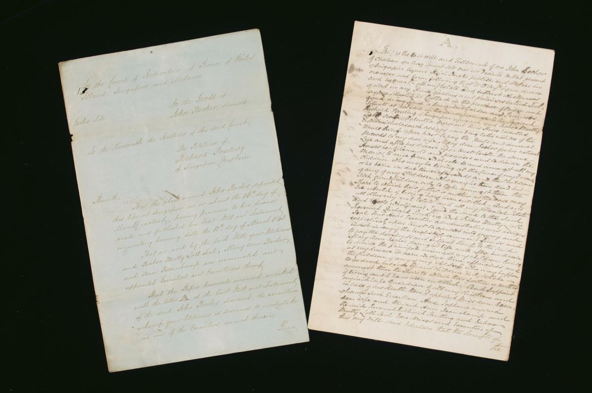 This is the last will and testament of John Becher issued on 13 March 1843. It is part of a collection of legal documents from the 19th and early 20th centuries which provides a glimpse into the work of the notable personalities who left their mark on Singapore’s legal history, and the economic and other transactions undertaken by ordinary immigrants in 19th century Singapore that tell stories of misfortune and indebtedness which would otherwise have disappeared from history.