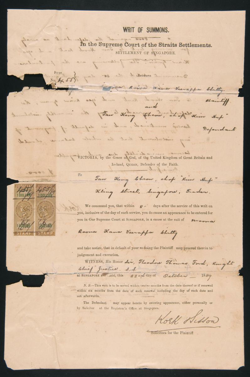 This is a writ of summons issued on 30 October 1886 to Yap San Tye, the defendant in the suit against the plaintiff Yap Pye Ho, who was carrying business under Hock Guan Chan in Saigon. It is part of a collection of legal documents from the 19th and early 20th centuries which provides a glimpse into the work of the notable personalities who left their mark on Singapore’s legal history, and the economic and other transactions undertaken by ordinary immigrants in 19th century Singapore that tell stories of misfortune and indebtedness which would otherwise have disappeared from history.