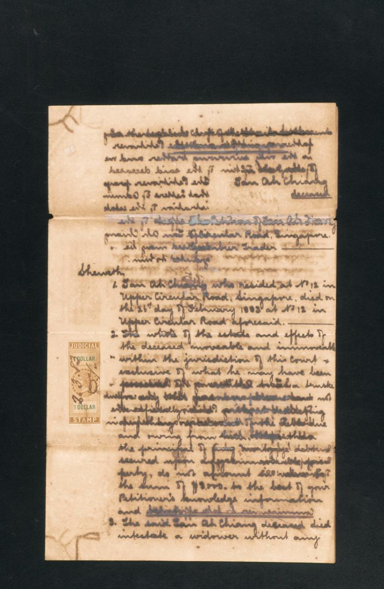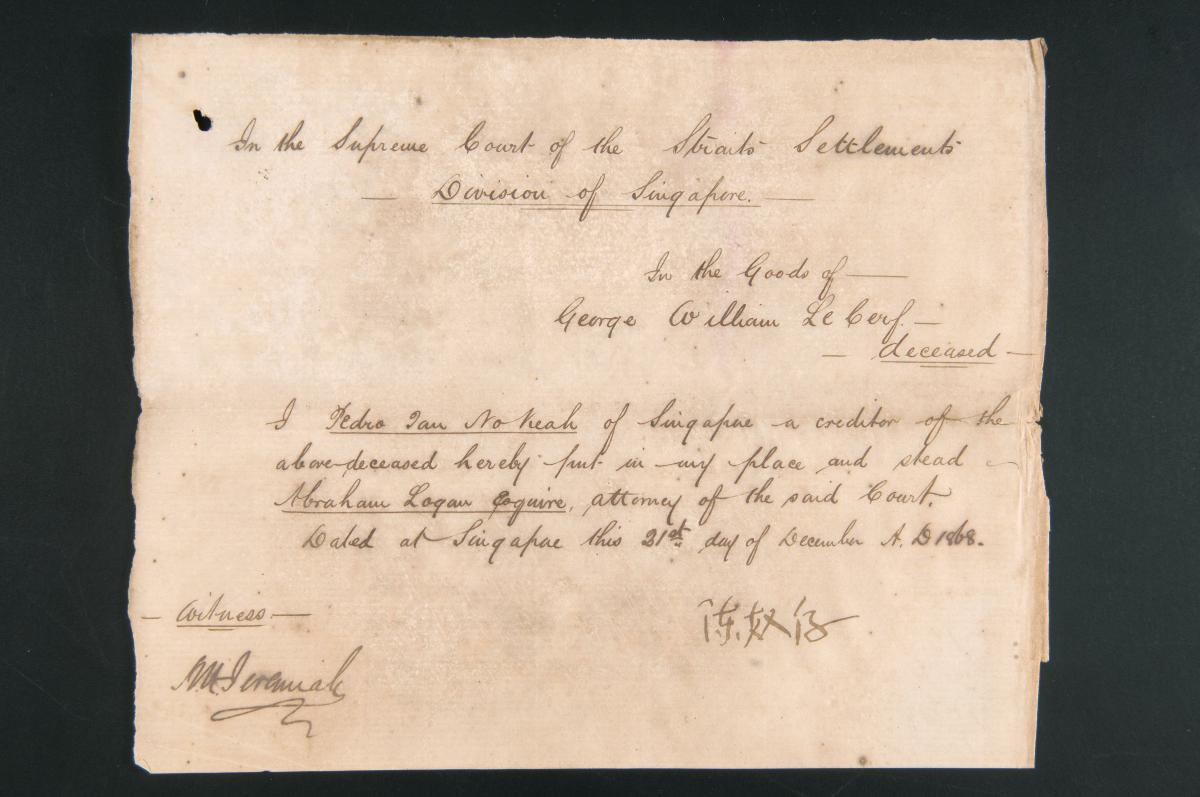 These are the warrant to act and the petition issued by Tan Ah Heang concerning the administration of the estate of Tan Ah Chiang. They are part of a collection of legal documents from the 19th and early 20th centuries which provides a glimpse into the work of the notable personalities who left their mark on Singapore’s legal history, and the economic and other transactions undertaken by ordinary immigrants in 19th century Singapore that tell stories of misfortune and indebtedness which would otherwise have disappeared from history.