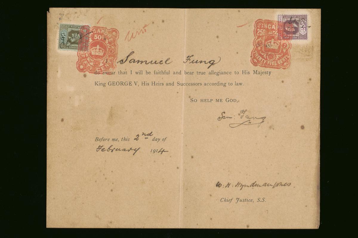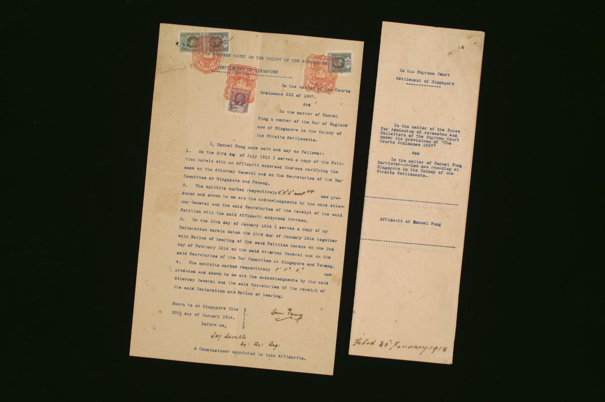 This is an affidavit of Samuel Fung filed on 28 October 1913. It is part of a collection of legal documents from the 19th and early 20th centuries which provides a glimpse into the work of the notable personalities who left their mark on Singapore’s legal history, and the economic and other transactions undertaken by ordinary immigrants in 19th century Singapore that tell stories of misfortune and indebtedness which would otherwise have disappeared from history.