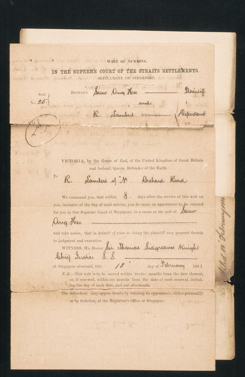 This is a statement of reply filed on 2 May 1881 concerning the suit between Seow Ang Hee (plaintiff) and R. Lambert (defendant). It is part of a collection of legal documents from the 19th and early 20th centuries which provides a glimpse into the work of the notable personalities who left their mark on Singapore’s legal history, and the economic and other transactions undertaken by ordinary immigrants in 19th century Singapore that tell stories of misfortune and indebtedness which would otherwise have disappeared from history.