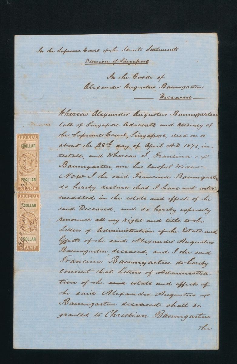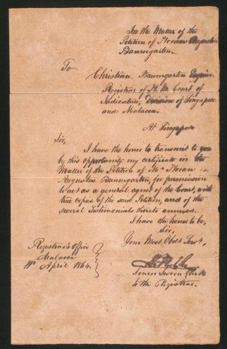 This is a letter dated 29 June 1858 from Ally M. Aiken, the law agent for Seah Eu Chin, to C. Baumgarten, concerning the administration of the estate of the deceased Seah Ah Choy. It is part of a collection of legal documents from the 19th and early 20th centuries which provides a glimpse into the work of the notable personalities who left their mark on Singapore’s legal history, and the economic and other transactions undertaken by ordinary immigrants in 19th century Singapore that tell stories of misfortune and indebtedness which would otherwise have disappeared from history.