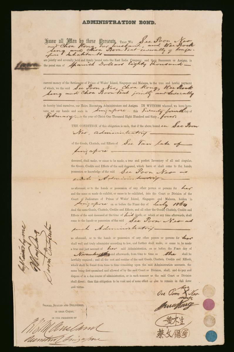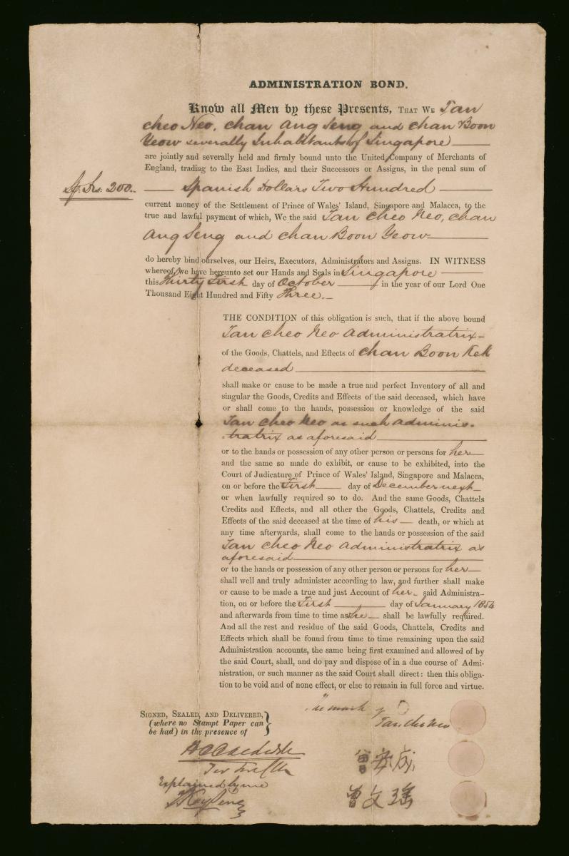 This is the administration bond of Kow Ing Saing, Tan See Keng, and Tio Pyah of Singapore sworn on 4 October 1878 concerning the administration of the estate of the deceased Ong Quee Haw. It is part of a collection of legal documents from the 19th and early 20th centuries which provides a glimpse into the work of the notable personalities who left their mark on Singapore’s legal history, and the economic and other transactions undertaken by ordinary immigrants in 19th century Singapore that tell stories of misfortune and indebtedness which would otherwise have disappeared from history.