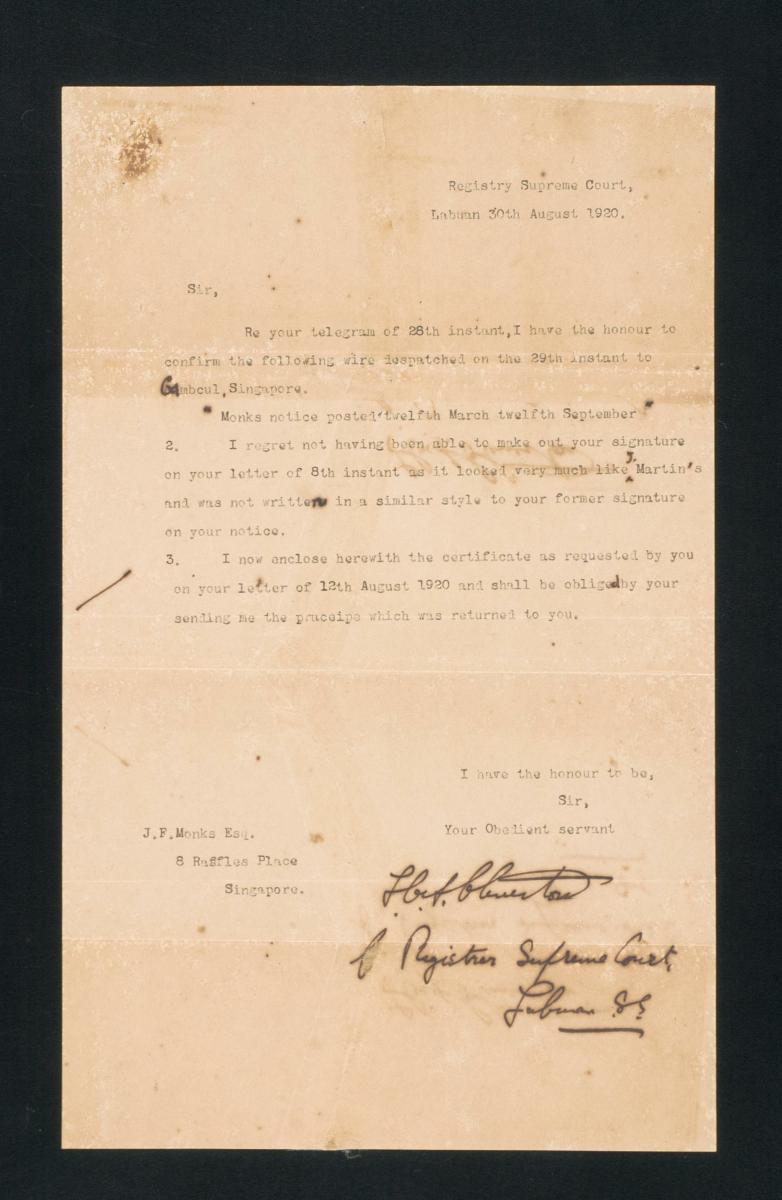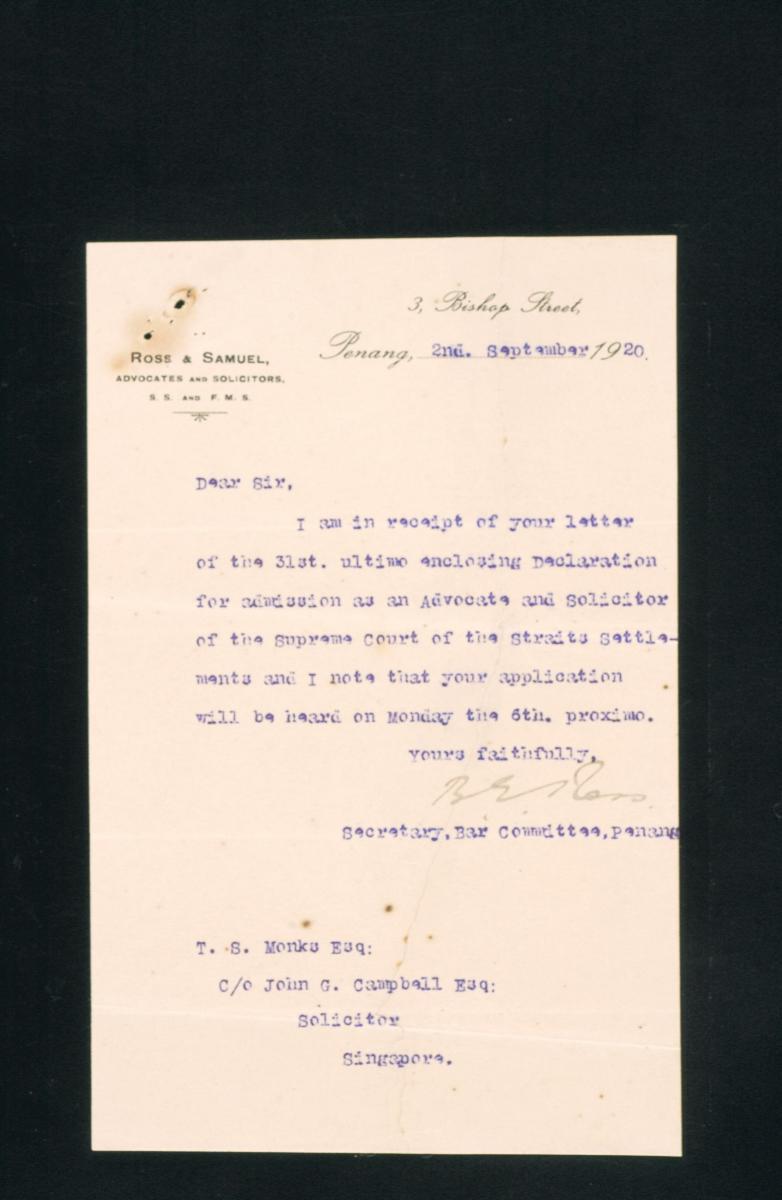 This is a letter from the Acting Attorney General to Thomas Francis Monks dated 1 September 1920. The Acting Attorney General acknowledged receipt of Monk's previous letter notifying him that the hearing of Monk's application for admission as a solicitor and advocate to the Supreme Court of the Straits Settlements was set for 6 September 1920. This letter is part of a collection of legal documents from the 19th and early 20th centuries which provides a glimpse into the work of the notable personalities who left their mark on Singapore’s legal history, and the economic and other transactions undertaken by ordinary immigrants in 19th century Singapore that tell stories of misfortune and indebtedness which would otherwise have disappeared from history.