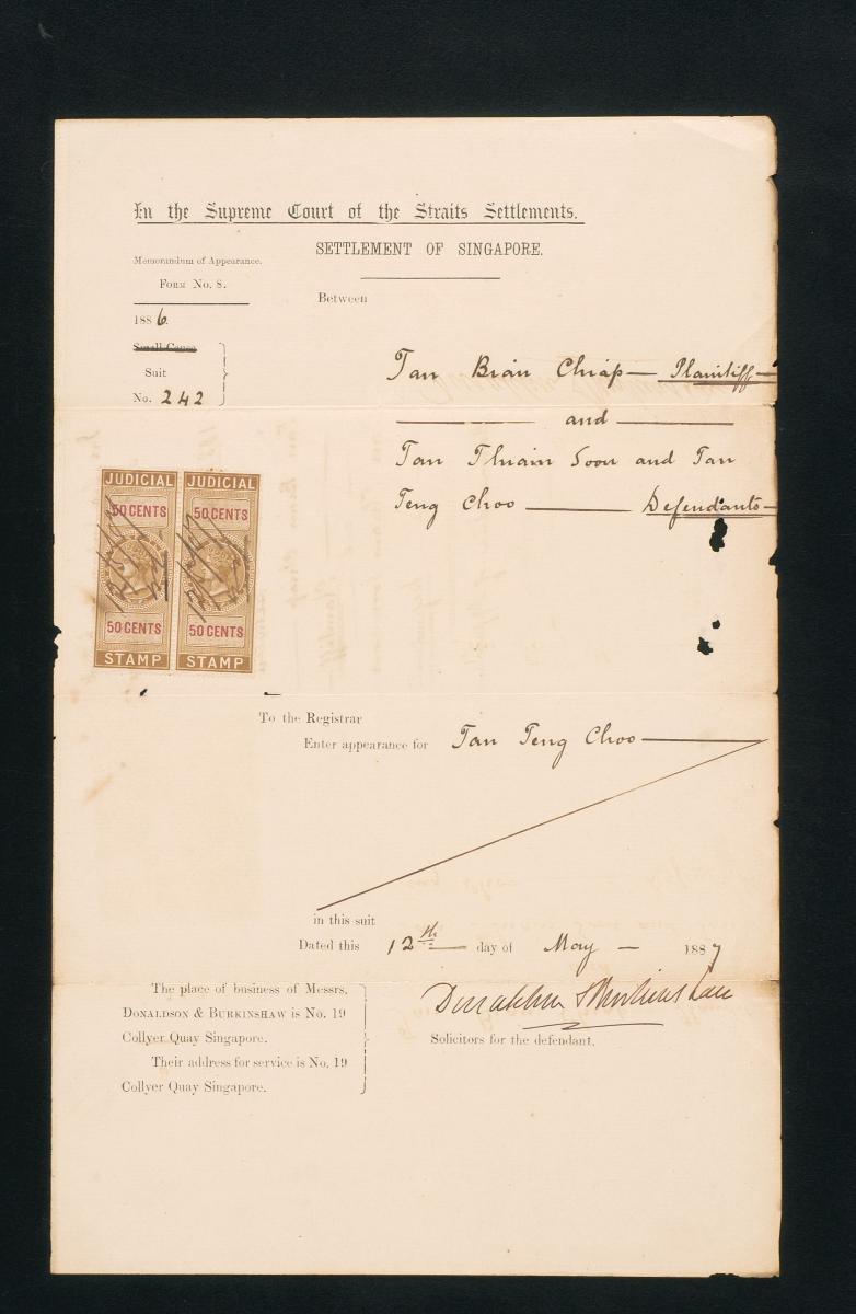 This is a memorandum of appearance filed on 14 May 1881 for the defendant Toh Teng Cheow, who was represented by his guardian Oon Syn Choe in the suit against the plaintiff Kam Boon Poh. It is part of a collection of legal documents from the 19th and early 20th centuries which provides a glimpse into the work of the notable personalities who left their mark on Singapore’s legal history, and the economic and other transactions undertaken by ordinary immigrants in 19th century Singapore that tell stories of misfortune and indebtedness which would otherwise have disappeared from history.