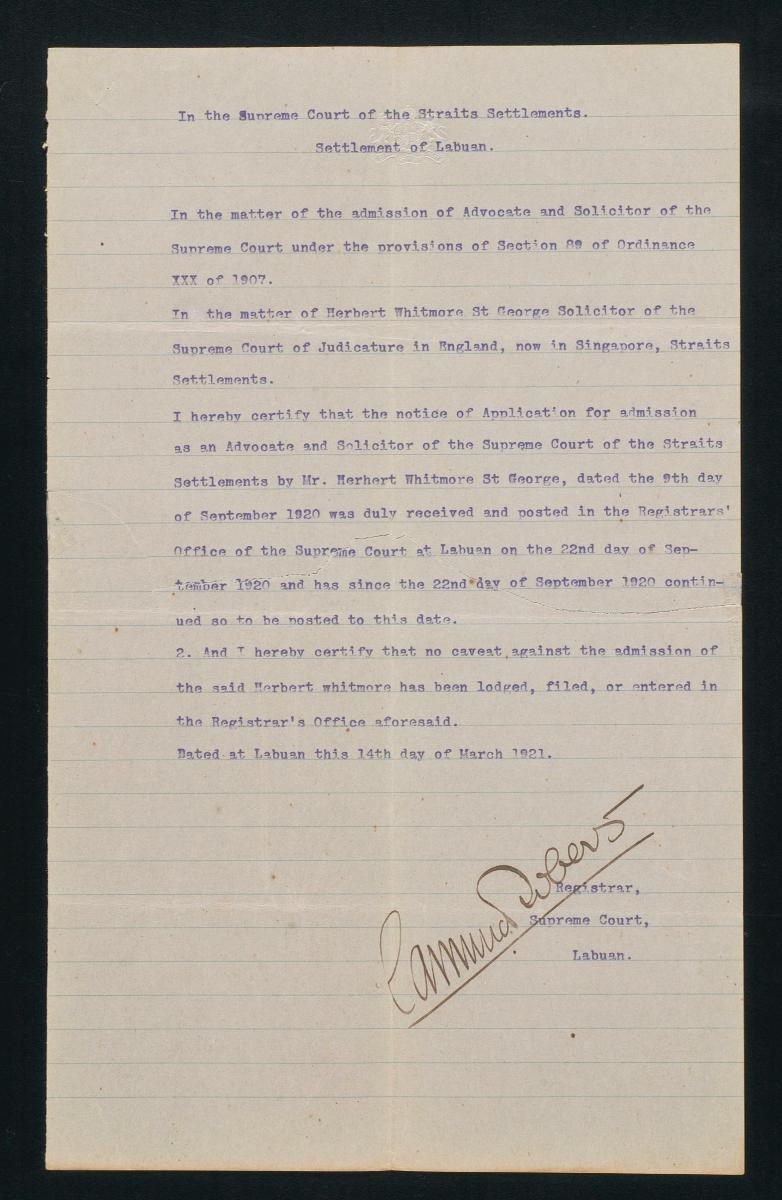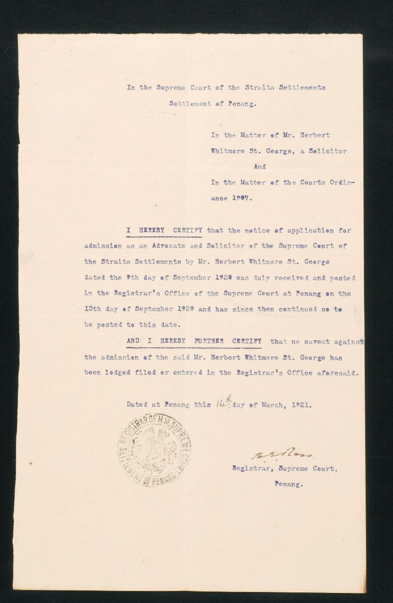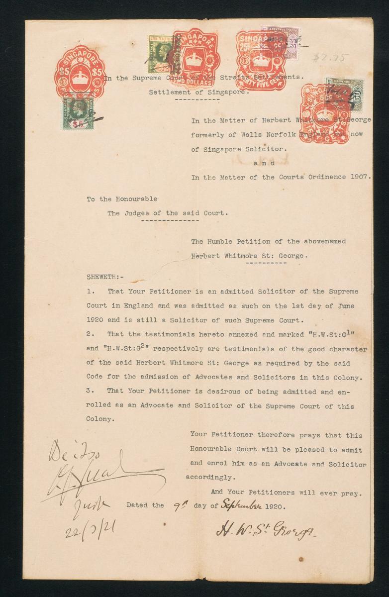This is a notice filed by Herbert Whitmore St George on 9 September 1920, concerning the filing of his petition for admission as a solicitor and advocate to the Supreme Court of the Straits Settlements. It is part of a collection of legal documents from the 19th and early 20th centuries which provides a glimpse into the work of the notable personalities who left their mark on Singapore’s legal history, and the economic and other transactions undertaken by ordinary immigrants in 19th century Singapore that tell stories of misfortune and indebtedness which would otherwise have disappeared from history.
