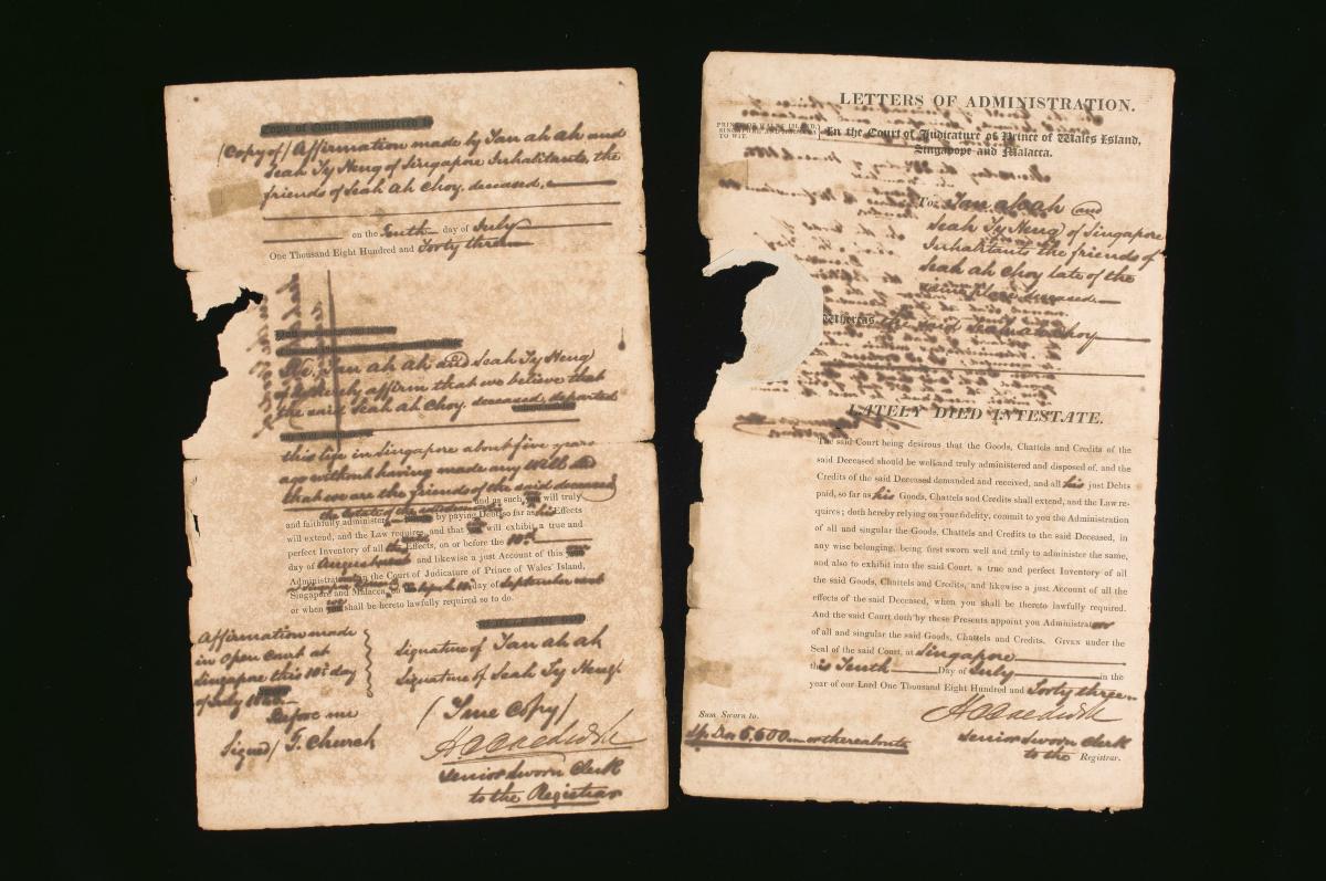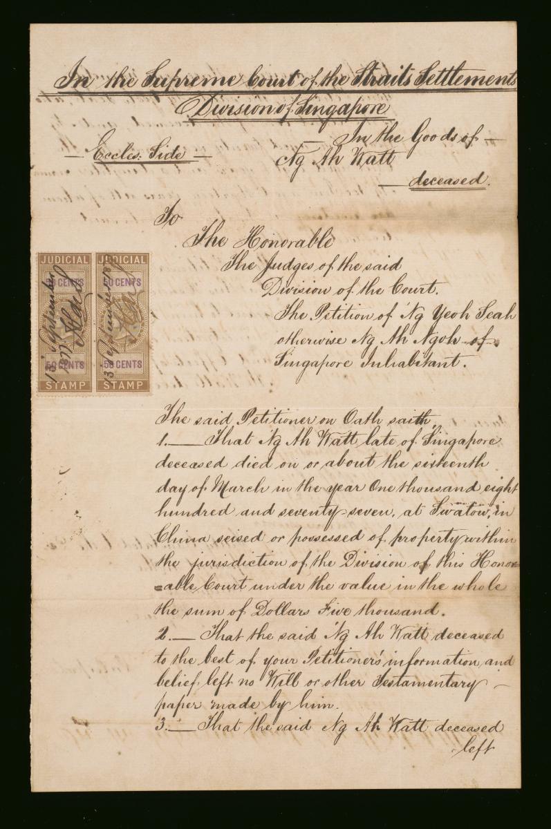 This is the petition of Yam Ah Ah and Seah Yh Heng concerning the estate of the deceased Seah Ah Choy. It is part of a collection of legal documents from the 19th and early 20th centuries which provides a glimpse into the work of the notable personalities who left their mark on Singapore’s legal history, and the economic and other transactions undertaken by ordinary immigrants in 19th century Singapore that tell stories of misfortune and indebtedness which would otherwise have disappeared from history.