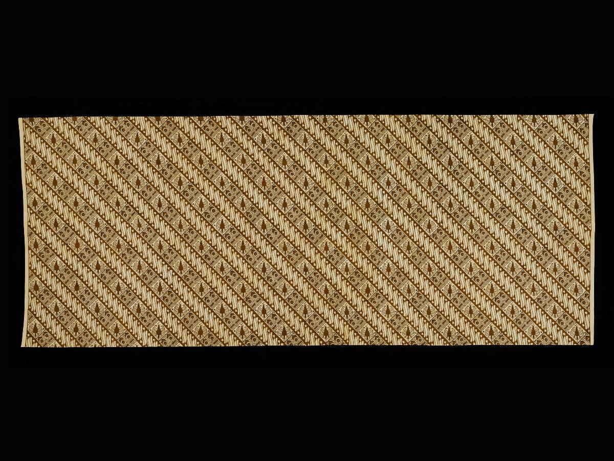 This batik-inspired skirt is worn with a matching blouse. It reflects the 1970s’ preference for bold and loud designs and exudes an ethnic aesthetic borrowed from the hippie culture of the 1960s.