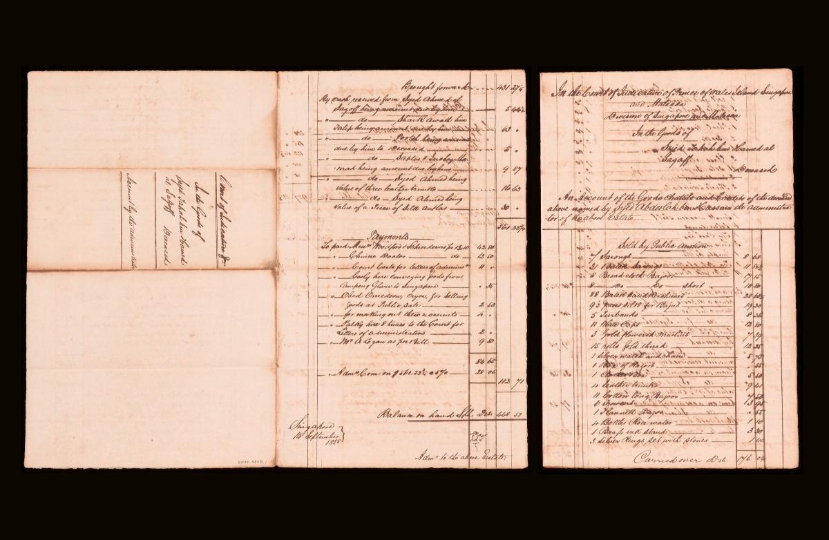 This is an account of the goods of Naimah Mahomed sold by public auction on the orders of Hosensa, the executor of the deceased's estate. It was issued on 30 April 1853. It is part of a collection of legal documents from the 19th and early 20th centuries which provides a glimpse into the work of the notable personalities who left their mark on Singapore’s legal history, and the economic and other transactions undertaken by ordinary immigrants in 19th century Singapore that tell stories of misfortune and indebtedness which would otherwise have disappeared from history.