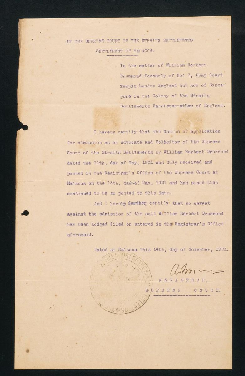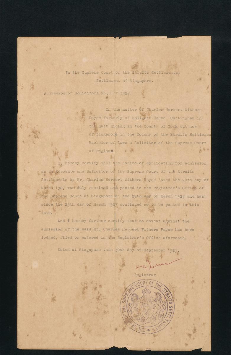 This is the registrar's certificate issued on 30 September 1927 by the Registrar of the Supreme Court of the Straits Settlements in Malacca for Charles Herbert Withers Payne, concerning the receipt of Payne's notice of application for admission as a solicitor and advocate to the Court. It is part of a collection of legal documents from the 19th and early 20th centuries which provides a glimpse into the work of the notable personalities who left their mark on Singapore’s legal history, and the economic and other transactions undertaken by ordinary immigrants in 19th century Singapore that tell stories of misfortune and indebtedness which would otherwise have disappeared from history.