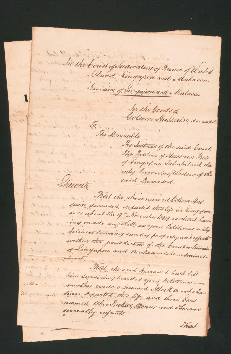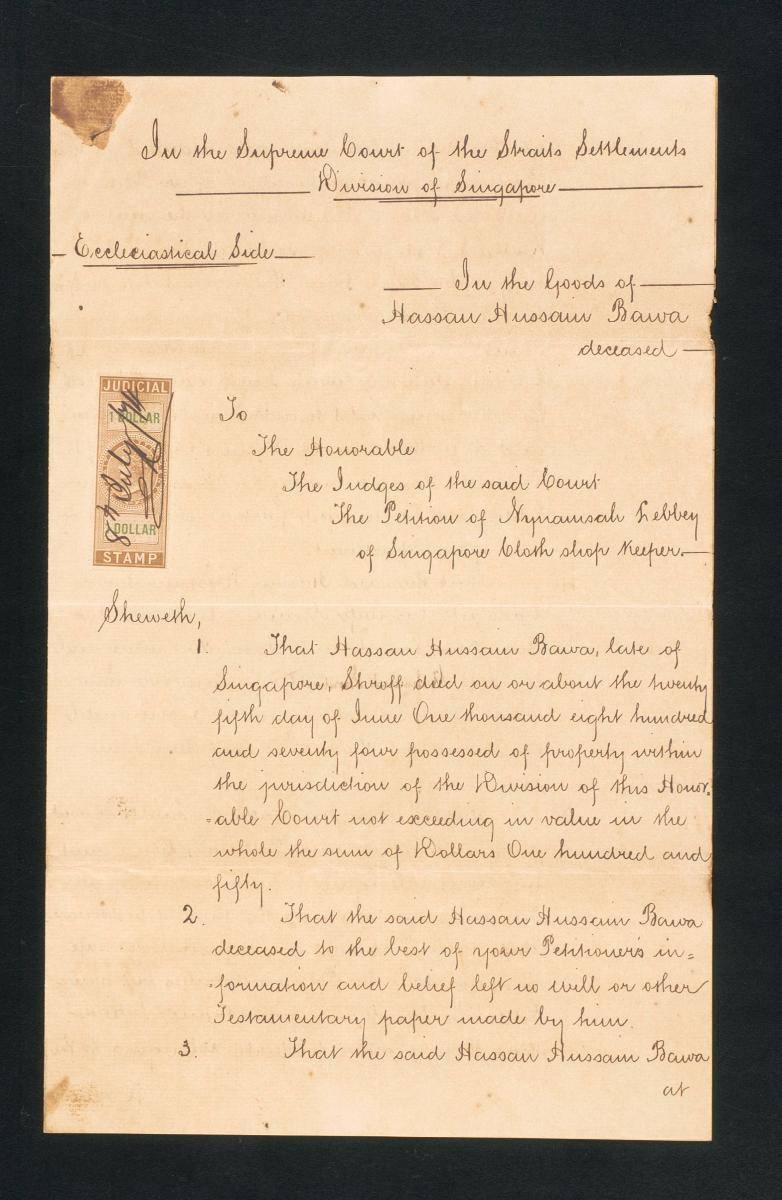 This is the petition of Hussain Saw concerning the administration of the estate of Nyma Mahomed. It is part of a collection of legal documents from the 19th and early 20th centuries which provides a glimpse into the work of the notable personalities who left their mark on Singapore’s legal history, and the economic and other transactions undertaken by ordinary immigrants in 19th century Singapore that tell stories of misfortune and indebtedness which would otherwise have disappeared from history.