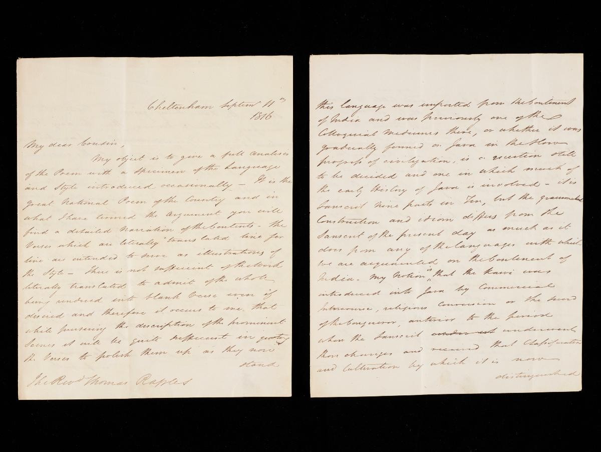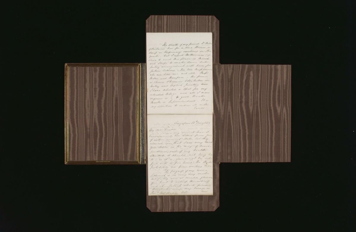 This rare letter of Raffles’, probably one of the first letters he wrote in his official residence on Government Hill (present-day Fort Canning) in January 1823, was addressed to his cousin in England, the Reverend Dr Thomas Raffles. It provides a vivid impression of Raffles’ strong optimism about the future of Singapore as a great emporium. He also mentions his plan for what would later become Raffles Institution. Yet he sounds physically exhausted, looking forward to leaving Singapore by the end of the year to retire in England.