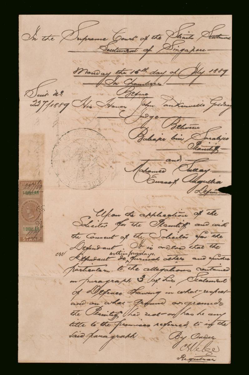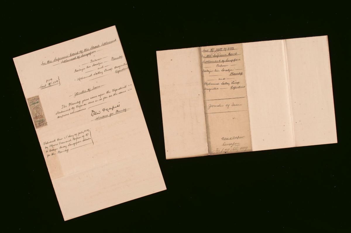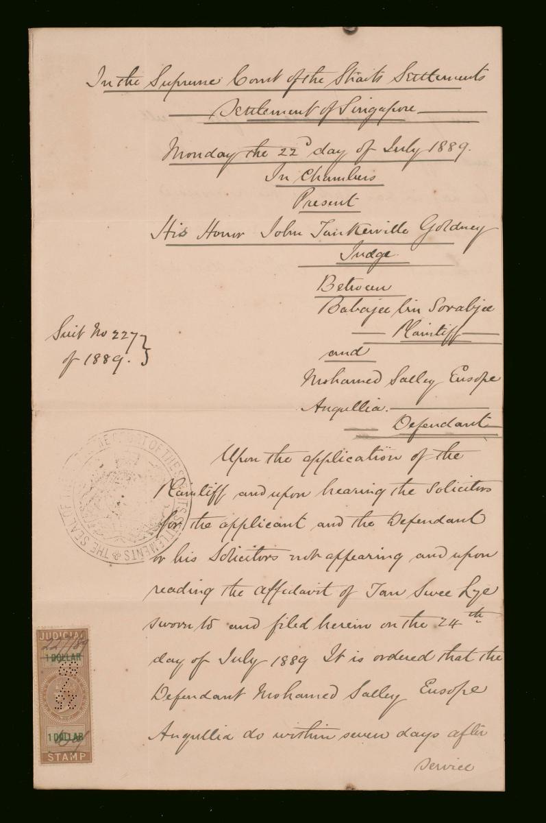 This is a statement of claim filed on 24 June 1889 concerning the suit between Babaji bin Sorabjee (plaintiff) and Mohamed Sallay E Angullia (defendant). It is part of a collection of legal documents from the 19th and early 20th centuries which provides a glimpse into the work of the notable personalities who left their mark on Singapore’s legal history, and the economic and other transactions undertaken by ordinary immigrants in 19th century Singapore that tell stories of misfortune and indebtedness which would otherwise have disappeared from history.