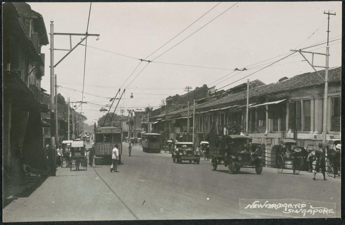 This shot of a crowded New Bridge Road was taken from the Singapore River near Coleman Bridge, showing rickshaw pullers heading west towards Chinatown.