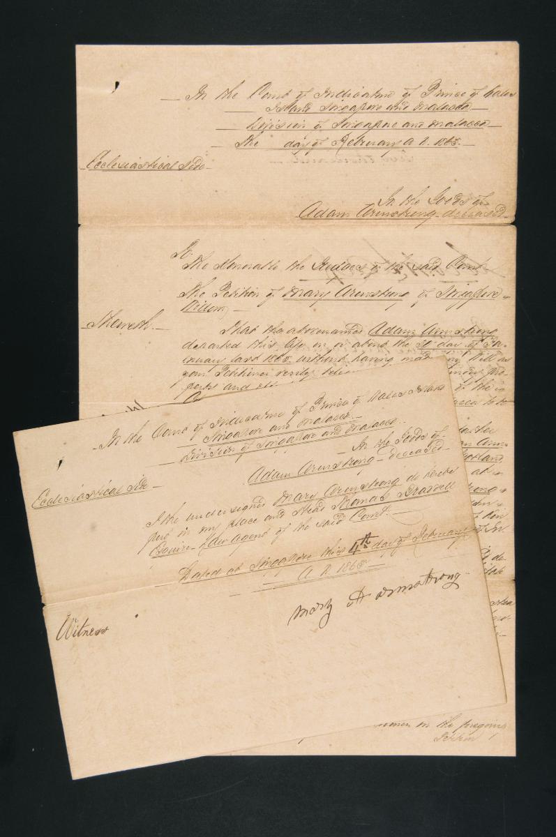 This is a set of documents concerning the administration of the estate of Eliza Armstrong. It is part of a collection of legal documents from the 19th and early 20th centuries which provides a glimpse into the work of the notable personalities who left their mark on Singapore’s legal history, and the economic and other transactions undertaken by ordinary immigrants in 19th century Singapore that tell stories of misfortune and indebtedness which would otherwise have disappeared from history.