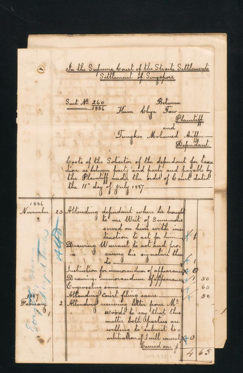 This is a bill of costs dated November 1885. It was acknowledged by the solicitor for the defendants, Charles Keish Elphinstore Woods (C.K.E. Woods). This document is part of a collection of legal documents from the 19th and early 20th centuries which provides a glimpse into the work of the notable personalities who left their mark on Singapore’s legal history, and the economic and other transactions undertaken by ordinary immigrants in 19th century Singapore that tell stories of misfortune and indebtedness which would otherwise have disappeared from history.