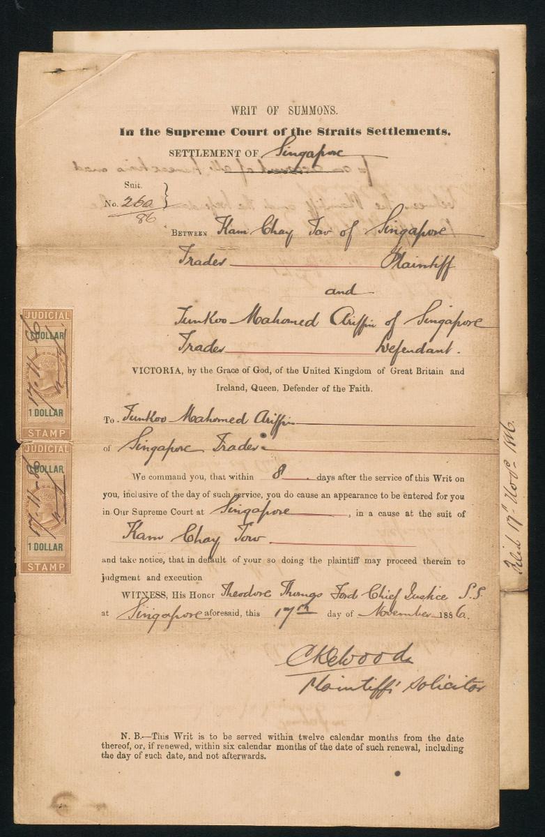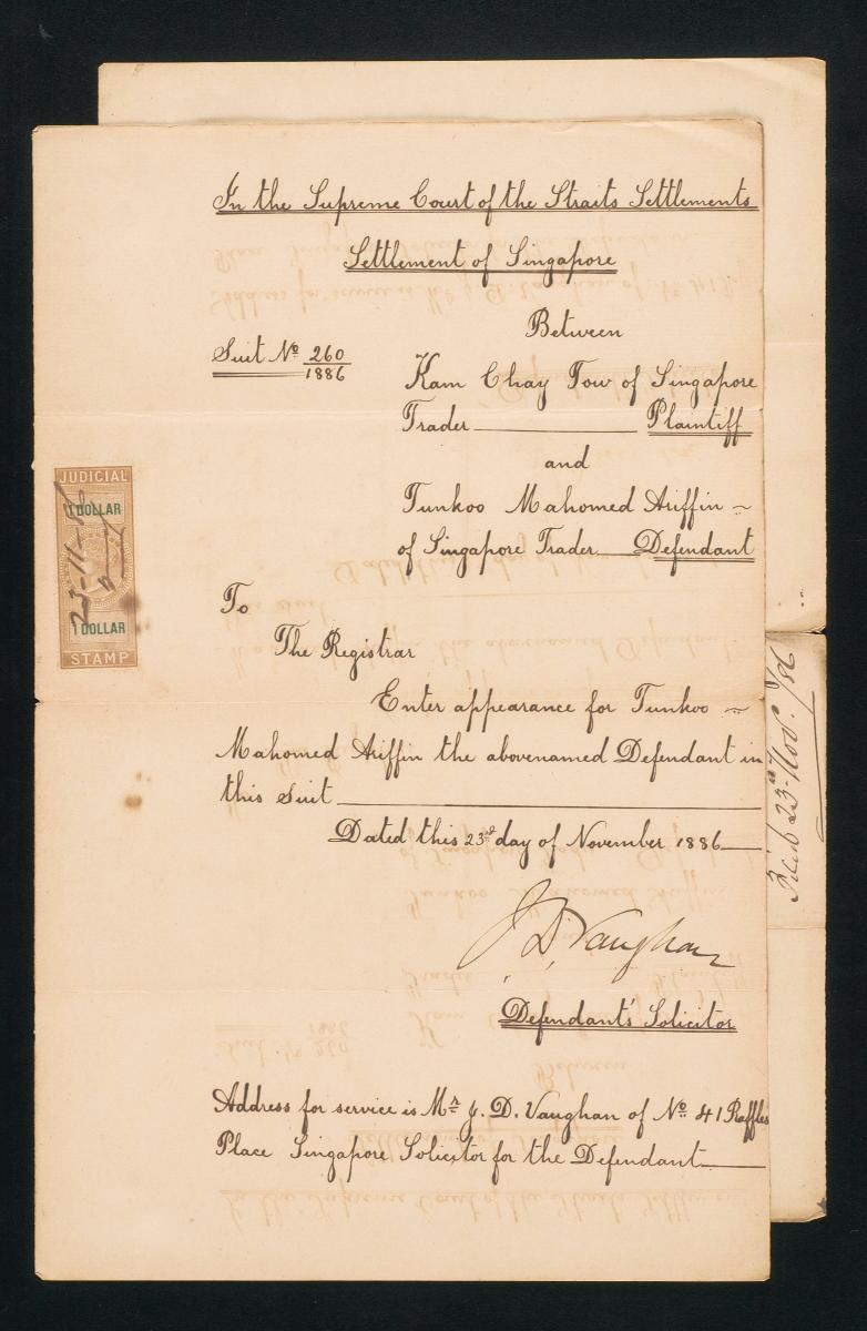 This is the bill of costs for Tunku Mahomed Ariffin issued under the court order dated 11 July 1887. He was the defendant in the suit against the plaintiff Kam Chay Tow. This document is part of a collection of legal documents from the 19th and early 20th centuries which provides a glimpse into the work of the notable personalities who left their mark on Singapore’s legal history, and the economic and other transactions undertaken by ordinary immigrants in 19th century Singapore that tell stories of misfortune and indebtedness which would otherwise have disappeared from history.