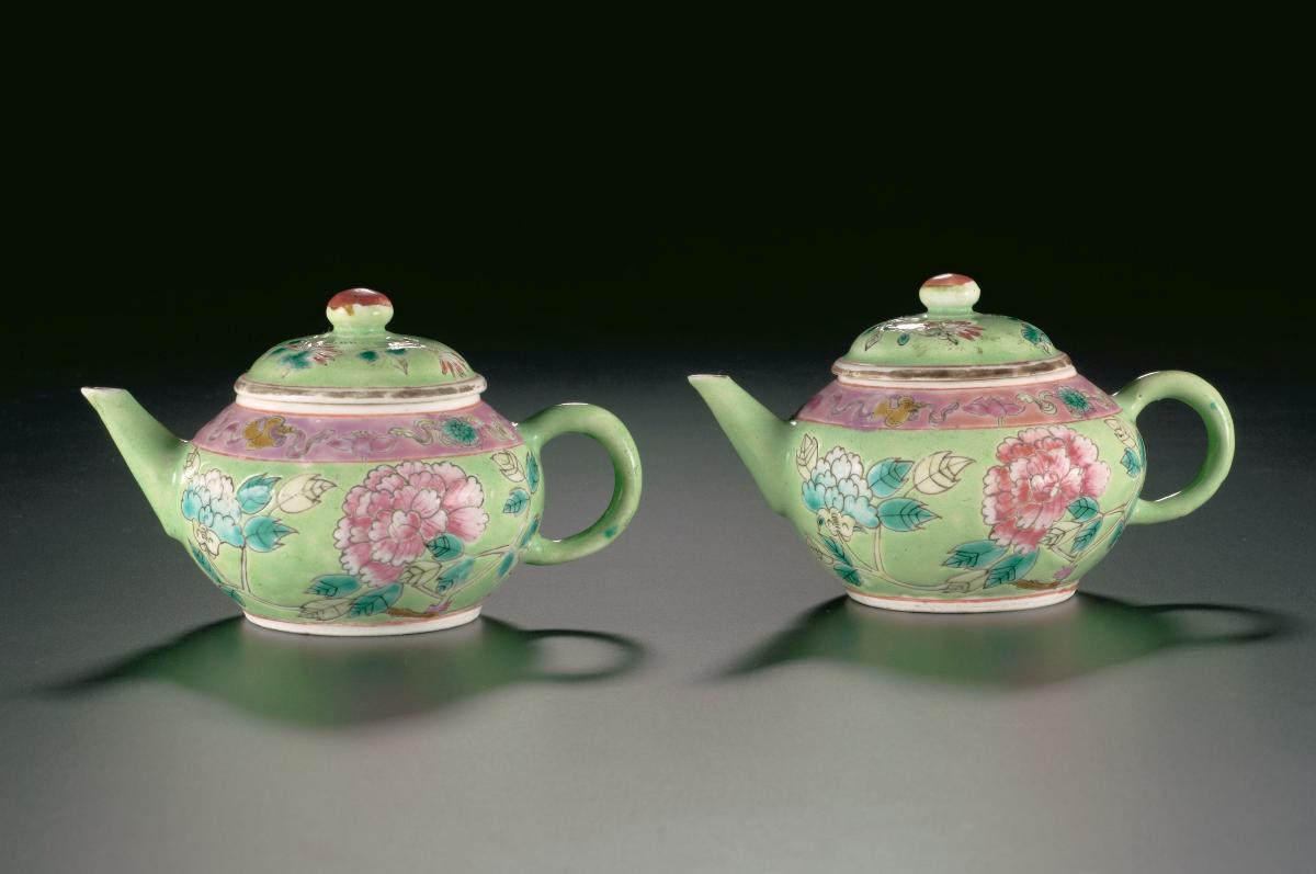 This pair of teapot stands with blue enamelled decoration were meant to hold Yixing teapots.During the early 17th century, Yixing wares consisted of unglazed vessels inspired by natural forms. Enamels were introduced in the 18th century. Thereafter it has been suggested designs that included enamelled background, which served to make the white glaze often painted beneath the lighter enamels, show up their tones better.Yixing stoneware was still popular, especially with the Straits Chinese communities in Southeast Asia during the early 20th century as is evident from this customised export ware.