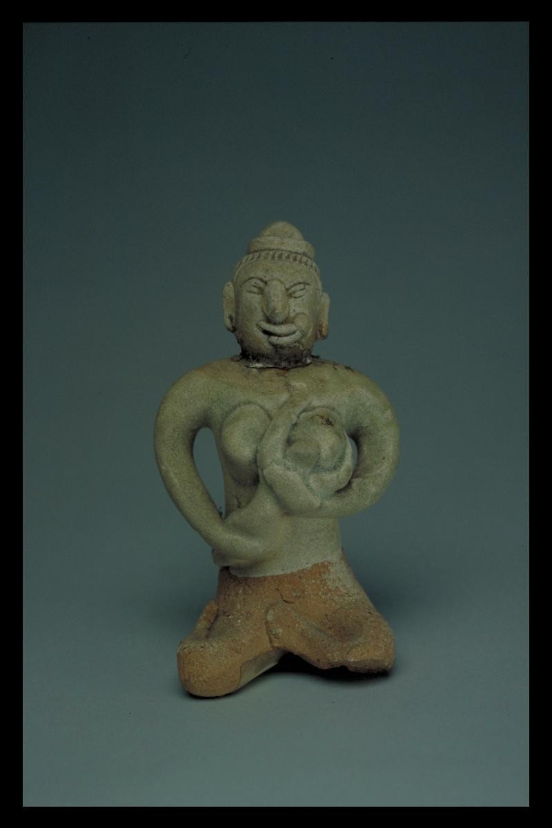 This seated female figure is depicted breast-feeding her baby. It is covered in uneven green glaze which has misfired in places. The simplistic modelling and incised facial features reflect the mass production of such figures, which are thought to have been used in rituals associated with protection during childbirth. Many figures have been found with their heads removed.