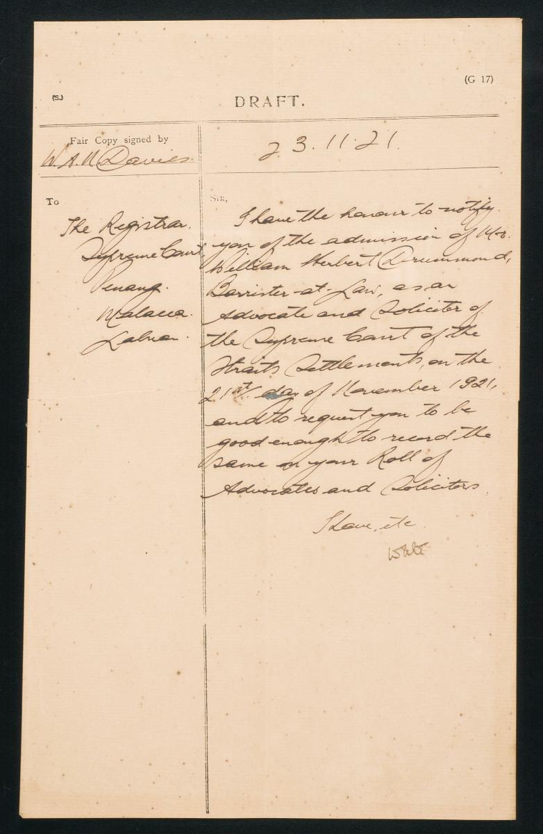 This is a letter dated 29 November 1921 from the Registrar of the Supreme Court of the Straits Settlements in Labuan to the Registrar in Singapore concerning the admission of William Herbert Drummond as a solicitor and advocate to the Court. It is part of a collection of legal documents from the 19th and early 20th centuries which provides a glimpse into the work of the notable personalities who left their mark on Singapore’s legal history, and the economic and other transactions undertaken by ordinary immigrants in 19th century Singapore that tell stories of misfortune and indebtedness which would otherwise have disappeared from history.
