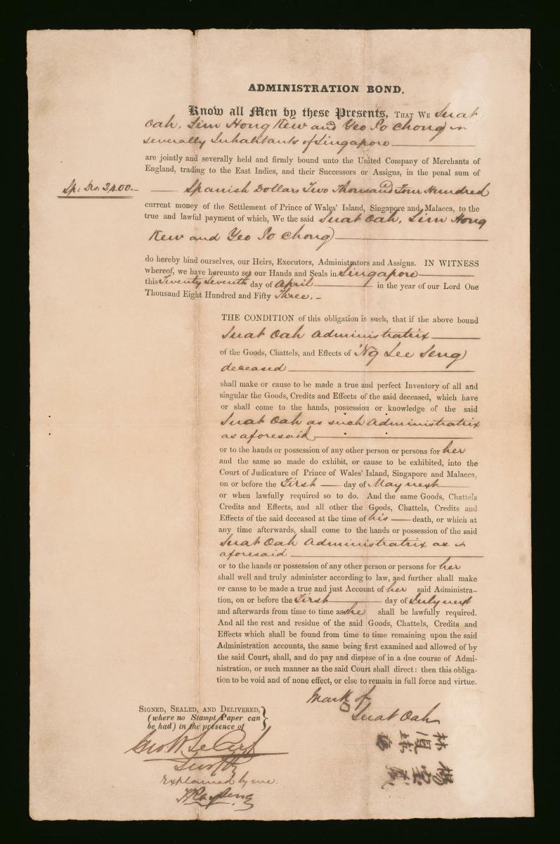This is the administration bond of Song Keng Kee, Laow Sye Ching, and Cho Sen Siang made on 12 May 1853 for the goods of Soh Wah Neo. It is part of a collection of legal documents from the 19th and early 20th centuries which provides a glimpse into the work of the notable personalities who left their mark on Singapore’s legal history, and the economic and other transactions undertaken by ordinary immigrants in 19th century Singapore that tell stories of misfortune and indebtedness which would otherwise have disappeared from history.