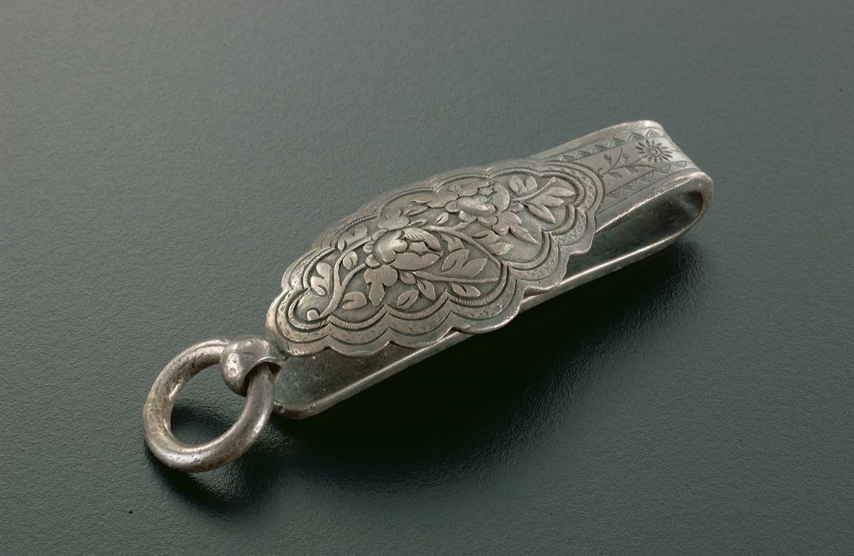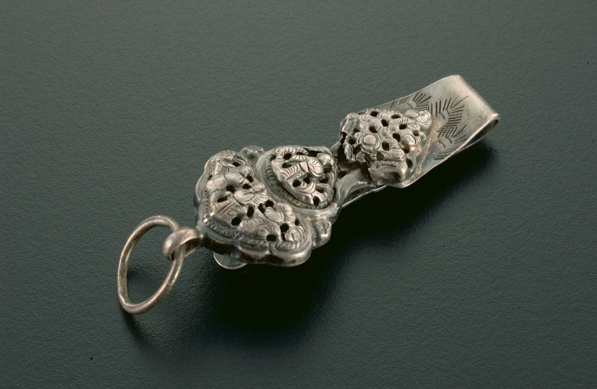 This unusually large silver key holder, known in Baba Malay as ‘ganshu konchi’, was worn as part of a man’s wedding costume. It consists of a heavy silver clip which hooks to the belt, and a thick silver ring onto which keys would be attached. The keyholder features repoussé and chased designs of auspicious mythical creatures such as the dragon, cranes, lion, peacock and deers. The dragon represents the emperor and is emblematic of male vigour. The peacock symbolised dignity and beauty, while the cranes symbolise longevity. The deer represents riches and lions, bravery and protection. Often, the attached keys were not functional, merely symbolic, implying the husband’s mastery of the household.