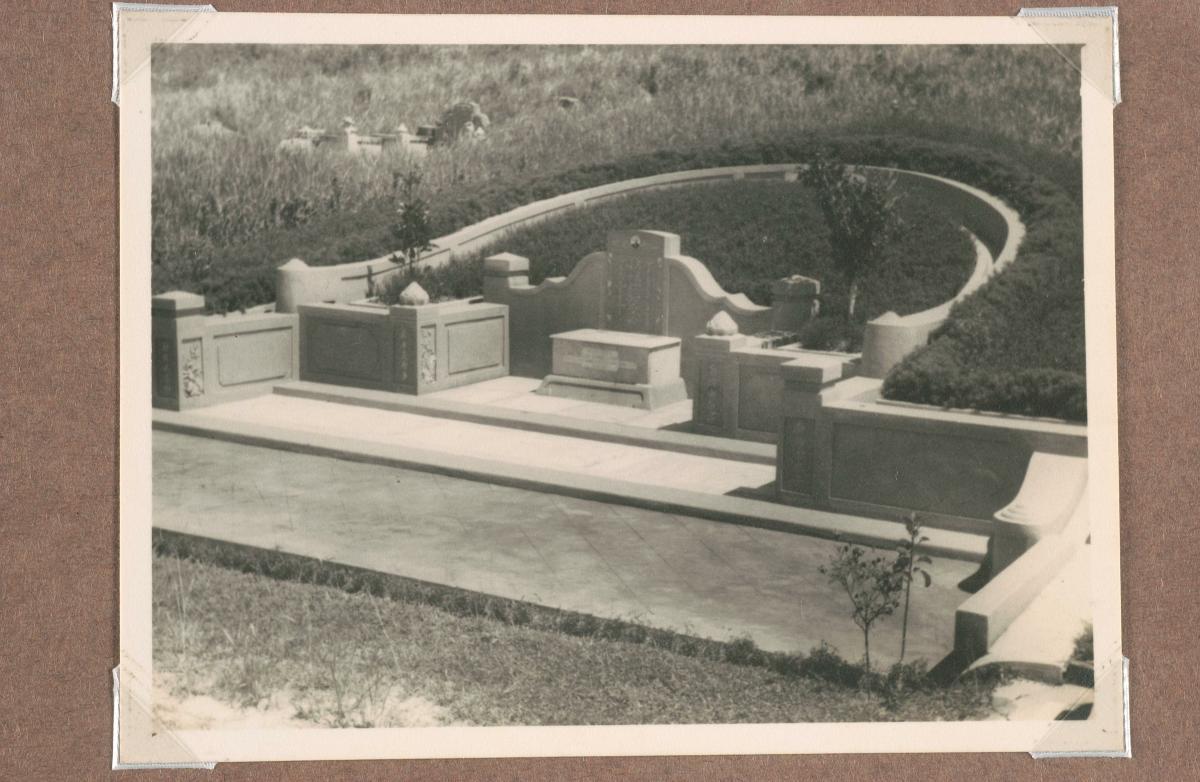 The boy is wearing a short-sleeved shirt, tan-coloured shorts with white socks and shoes. He is standing beside the grave of Madam Ng Xue Zhen.