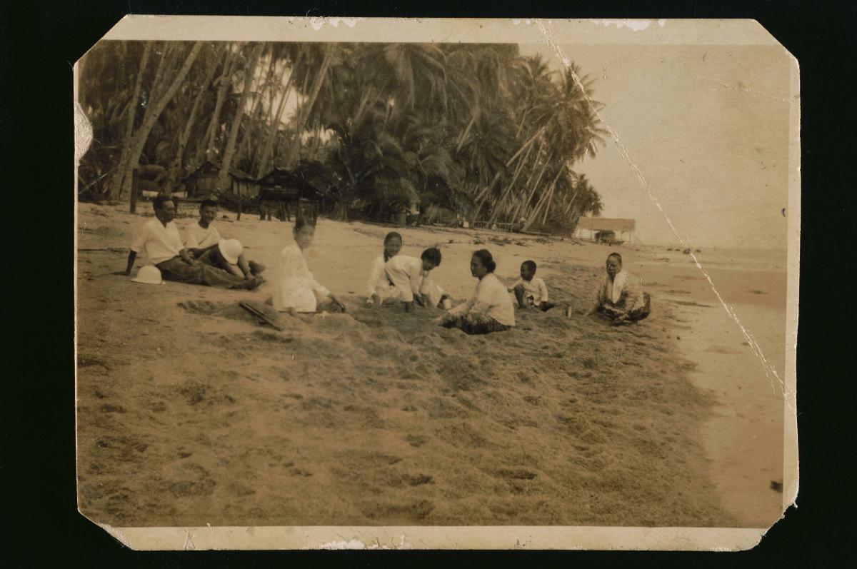 This photograph shows a Peranakan family. The Nyonya is wearing a baju kebaya, which was very popular among both Peranakans and non-Peranakans in the 1950s and 1960s. The Chinese woman in the samfoo standing behind the Nyonya, probably the servant, is carrying a baby. The Peranakans were often wealthy traders who could afford to indulge in ornate furnishings, jewellery and brocades.