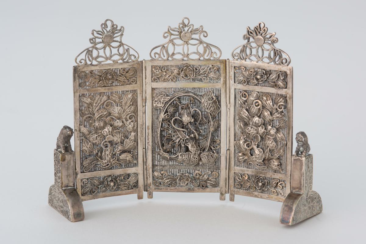 This Mughal architectural panel features three flowering plants (lilies and tulips) and four parrots perched on some of the branches. The parrots nibbling the buds is lively and visually engaging.