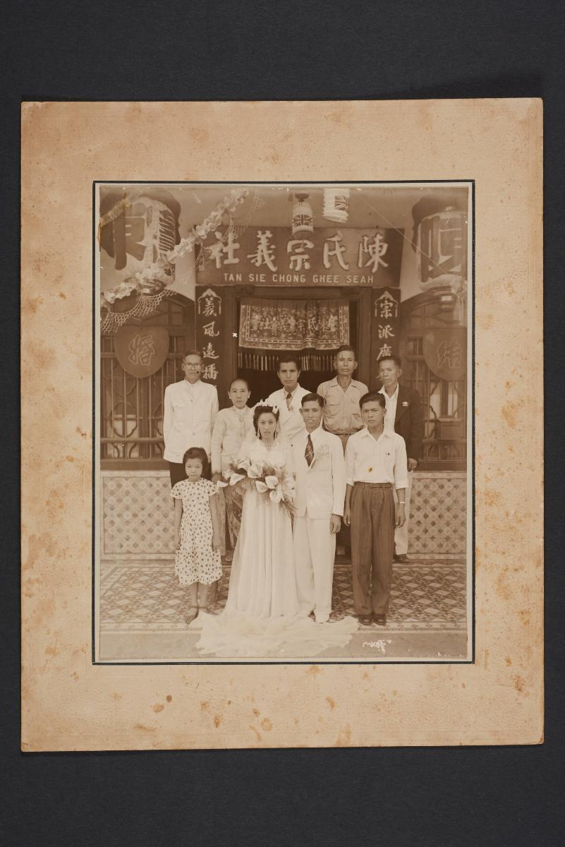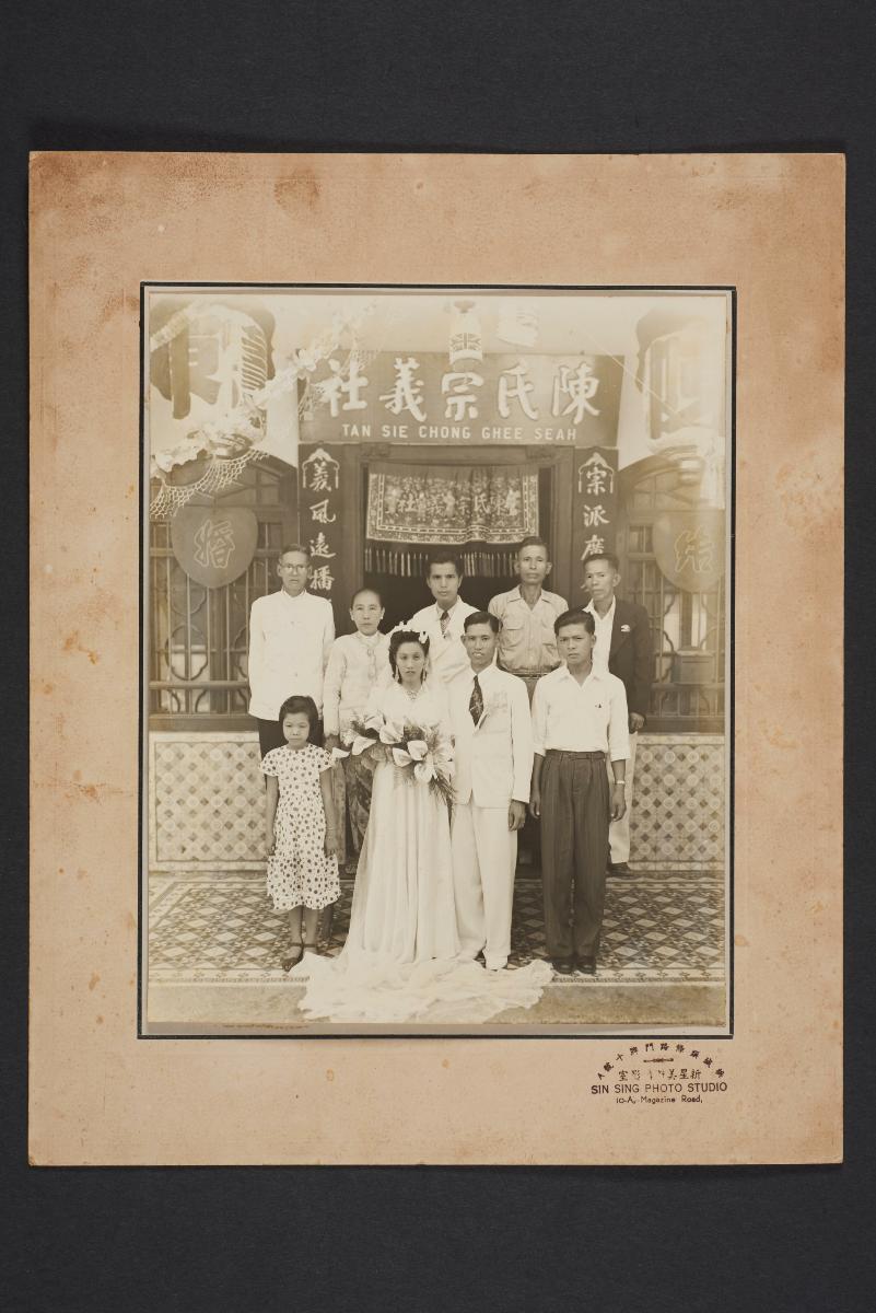 This is a studio wedding photograph of a Straits Chinese couple (both seated), bridesmaids (back row, left and right) and the best man (middle, back row). Both the groom and the best man are wearing Western-style suits while the bride and the bridesmaids are wearing loose straight-cut blouses with matching calf-length skirts. The women also sported bob haircuts and headbands, typical of the flapper style which was popular in the 1920s.