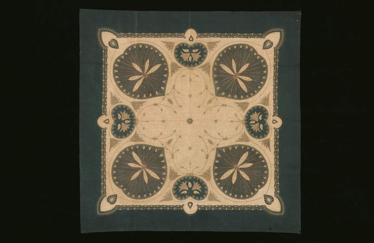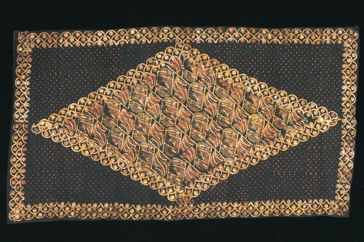 This round beadwork tablecloth is created using the technique of bead netting. A surface of beads is formed by inserting single or multiple threads through them to form a unified structure. Many auspicious meanings have been stitched onto this tablecloth. There are motifs of nine flowers clustered together. The Chinese character for the number nine (jiu) sounds like the character for ‘long’ and is used here to represent ‘everlasting happiness’. Four pairs of animals, the bat, deer, crane and ‘qilin’ surround the central floral motif. These paired motifs are symbols of double blessings. The bat, deer and crane symbolise happiness, wealth and longevity. The ‘qilin’ is a mythical Chinese hooved creature that is believed to be a bringer of sons. The piece also features insects like the dragonfly, grasshopper and cicada which are fertility symbols. This tablecloth was possibly used to cover the ‘spring table’ (choon tok) in the wedding chamber, where the bride and groom would have their first meal together.