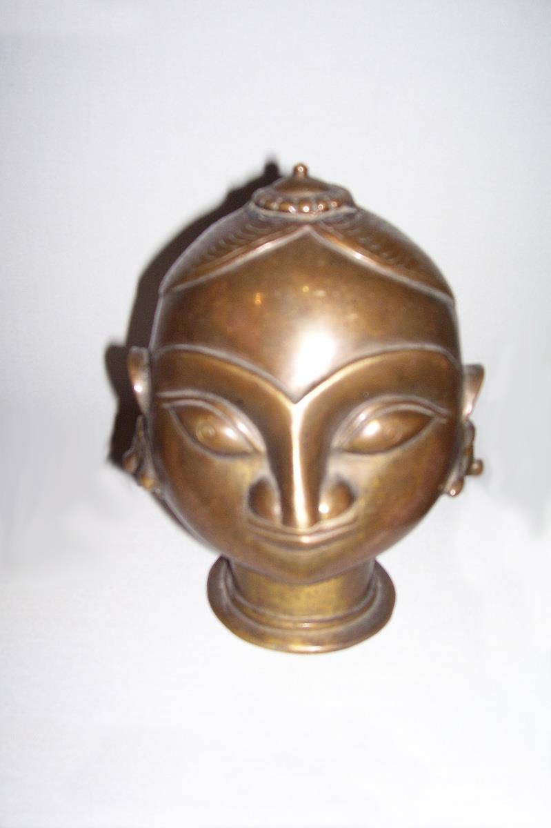 This mask depicts the face of Gauri, another name for Hindu goddess Parvati. Gauri's headgear and ear ornaments clearly indicate that this piece represents the goddess in the Marathi style whose head or mask is decorated during the Ganesh Chaturthi festival.This festival is celebrated in the months of August-September for a period of ten days and women celebrate a fertility rite by installing images of Gauri on mounds of grain, which would be dressed up like a married woman and worshipped for a few days. Parvati is associated with fertility, prosperity and women worship her for longevity of their husbands.