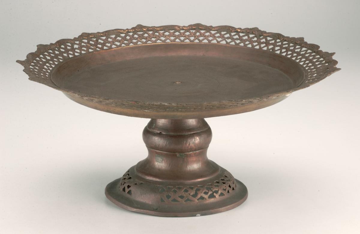 This pedestal tray with scalloped edge is which suggests that the emphasis was more on the functional shape of the object rather that then on the decorative pattern.