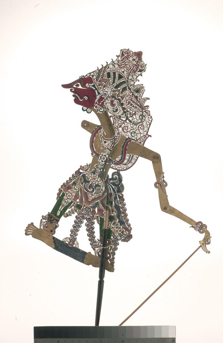 This puppet represents the character of Baladewa (Baladeva) the elder brother of Kresna (Krishna) from the epic, the Mahabharata performed in the Javanese 'wayang kulit' or leather shadow puppet theatre tradition. He is a bold character as indicated by his red face, forward-looking gaze and a wide stance.The Mahabharata relates the conflict and struggle between two sets of cousins, Pandawa (Pandava) and Korawa (Kaurava), over the rule of the kingdom of Astina (Hastinapura). The Pandawa brothers eventually overcome the Korawa in the Great War, the Bharatayuda. The vast majority of the ‘wayang’ plays performed are drawn from the two great Hindu epics, the Ramayana and the Mahabharata with as well as stories of Javanese origin. 'Wayang kulit' is considered as the highest of the Javanese performing arts. Performed in the royal courts of Java as early as the ninth century, this tradition continues to be treasured as one of the ‘pusaka’ or sacred heirlooms of the court. 'Wayang kulit' is traditionally performed on ritual days and religious ceremonies. It has also been adapted more recently for television and public education campaigns.