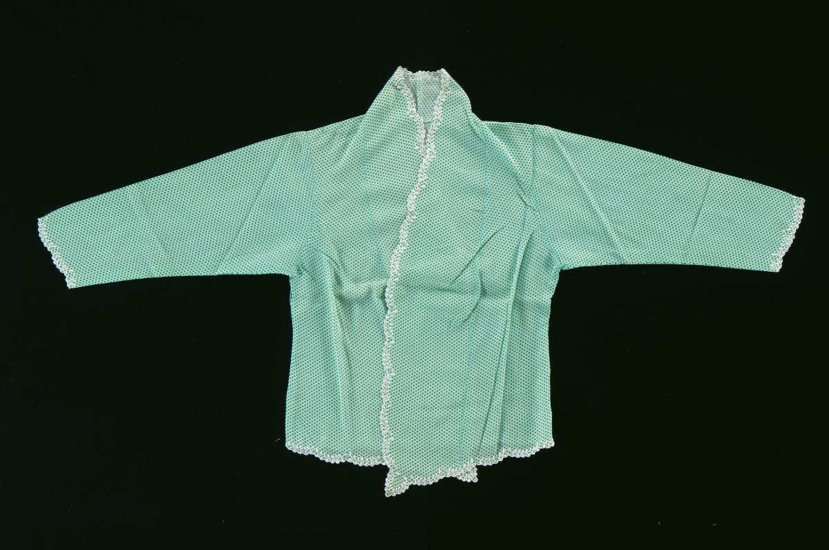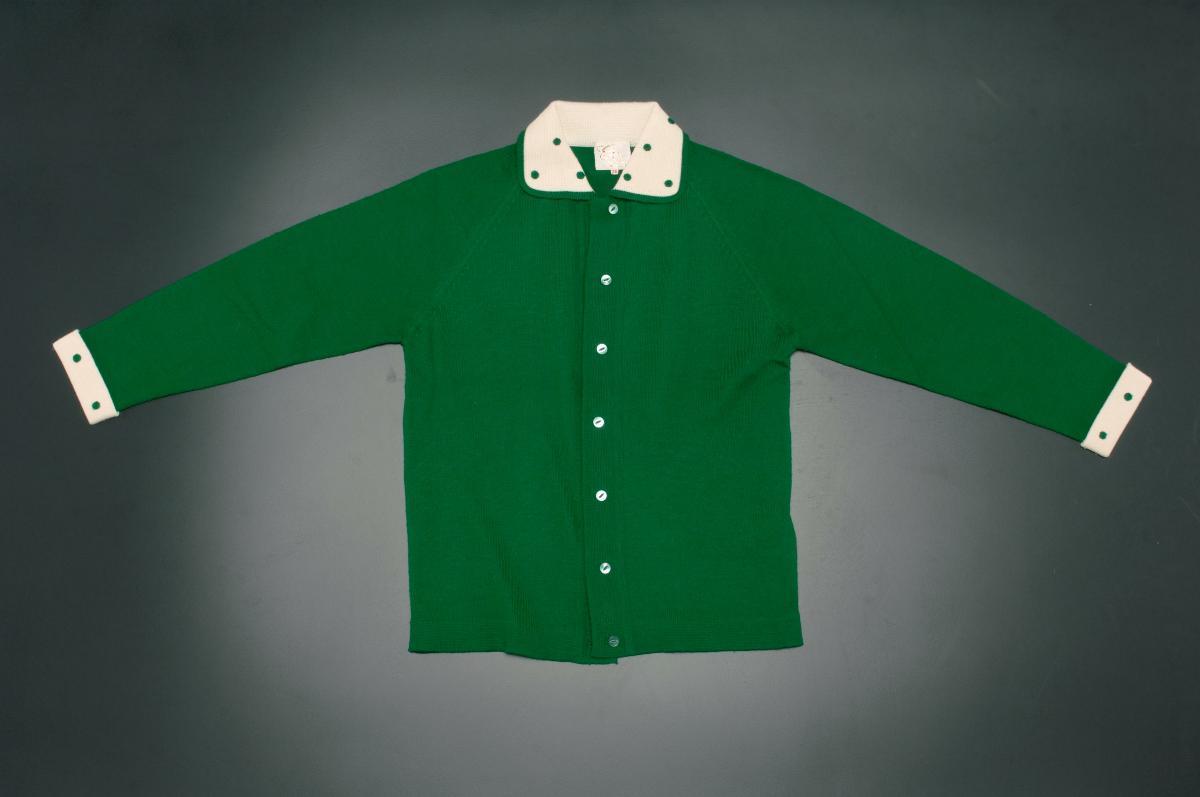 This knitted blouse is worn with a matching green cardigan. The style is typical of 1970s fashion.