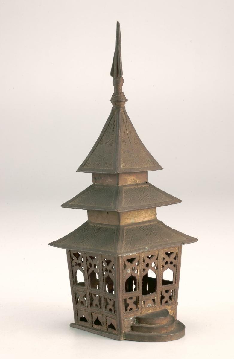 This model house reflects the traditional Minangkabau architecture, roofs of multiple spires which represent buffalo horns. Buffalos are integral to Minangkabau agriculture and commerce. Models of Minangkabau houses were usually made of cast brass.