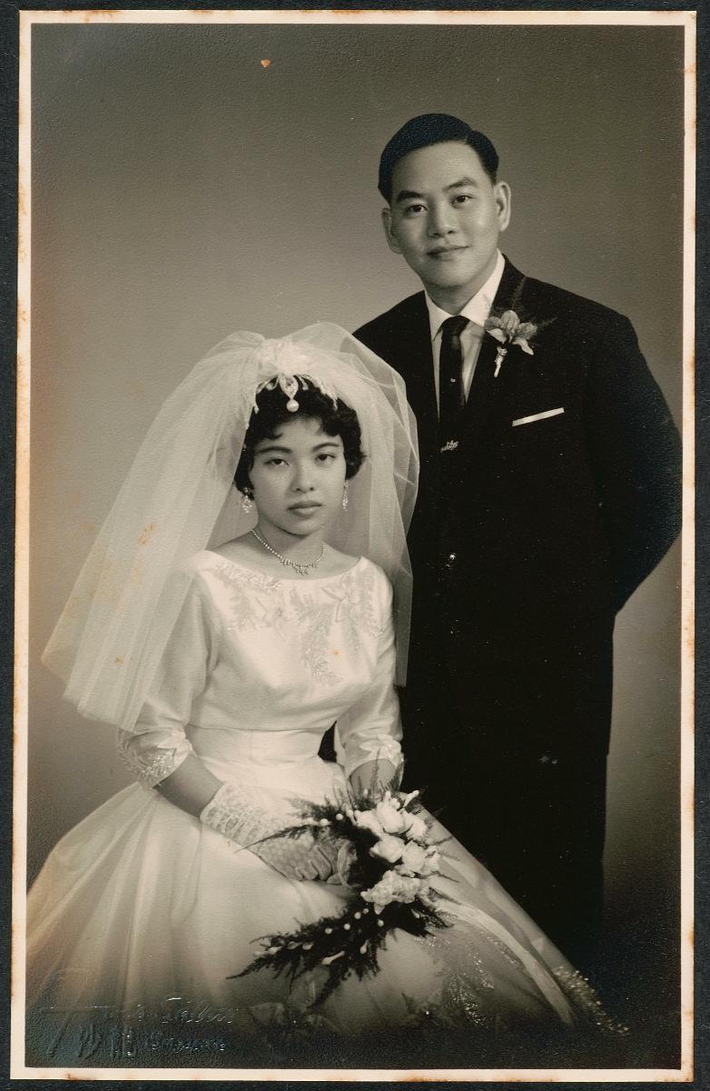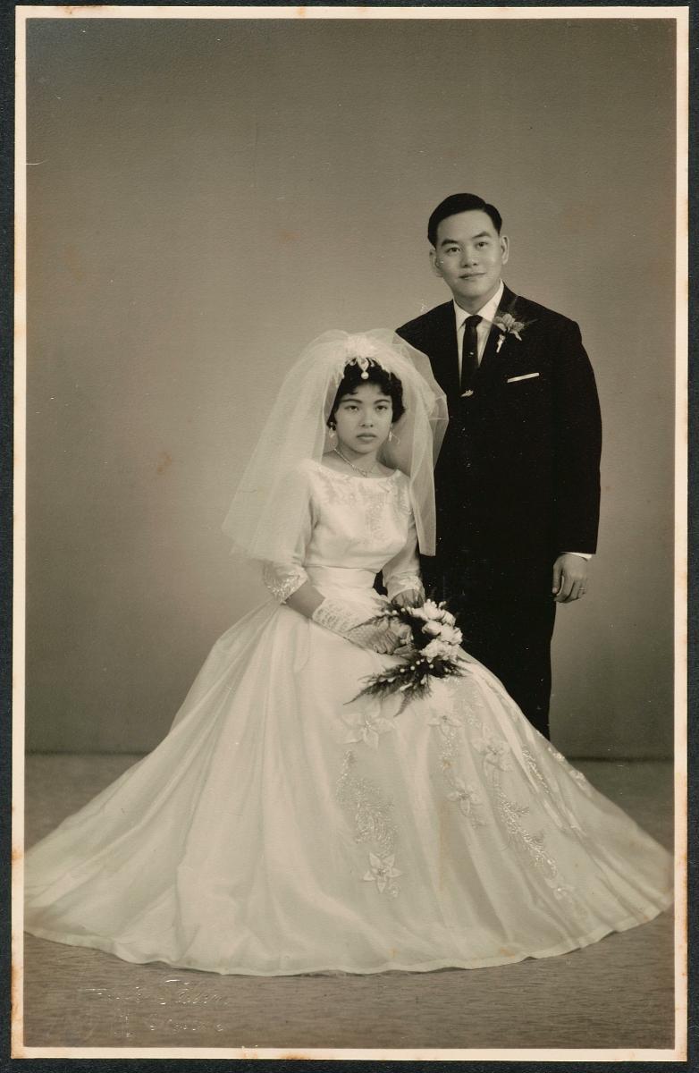 Studio portrait of a Chinese bride and groom, taken at the Foto Salon in Balestier Road