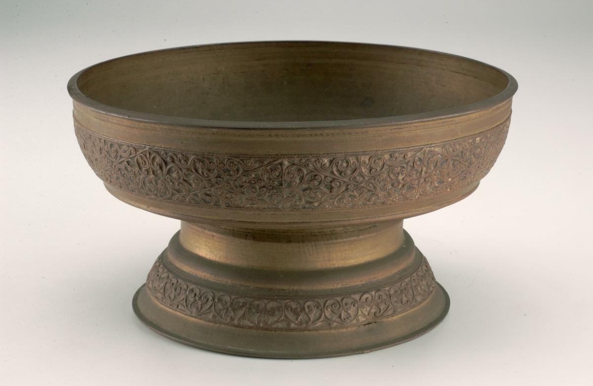 This pedestal sireh tray has openwork designs around and on base.Various types of betel or sireh set and receptacles were created in the Malay and Indonesian Archipelago to hold the ingredients of the betel chew. A set generally comprises a receptacle for holding betel leaves, pots for areca nut, gambier, lime and a nut cutter. A betel quid consists of a betel leaf smeared with lime, thin shavings of areca nut, gambier as well as other ingredient such as cloves.