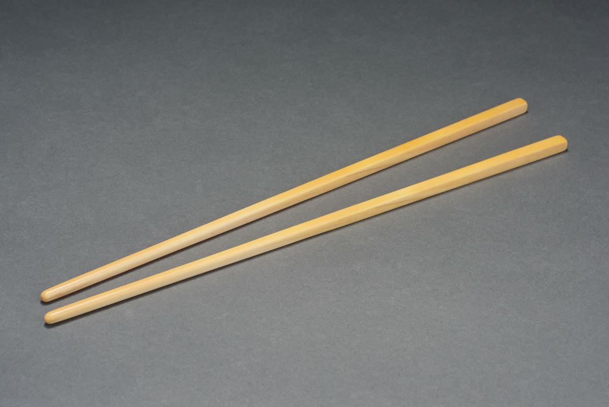 These chopsticks, used to eat ‘char kway teow’ (fried flat noodles) were usually placed in a brass chopstick holder (see 2006-01391), hung on the wall of a ‘char kway teow’ stall along the streets.