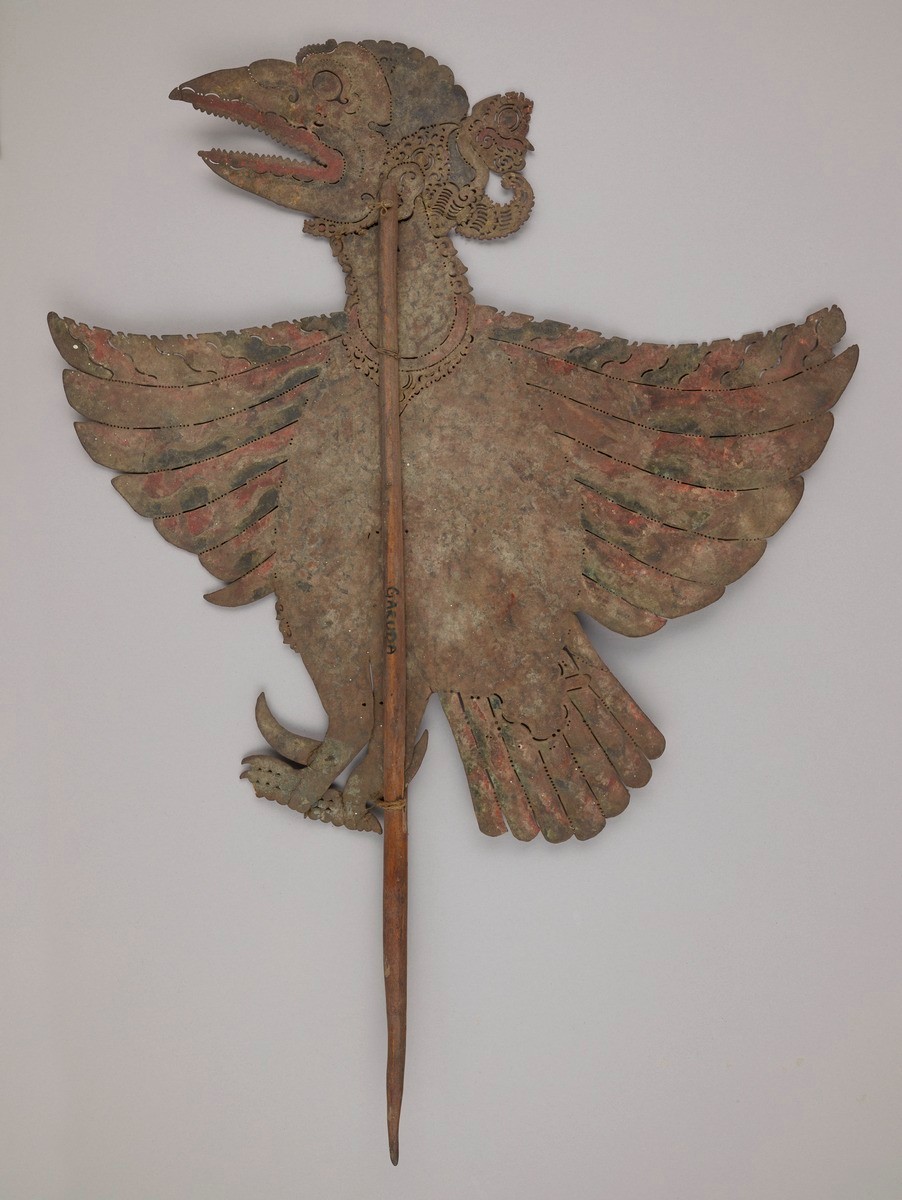 This puppet depicts Garuda, the mount of the Hindu god Vishnu, in the Javanese ‘wayang kulit’, or leather shadow puppet theatre tradition.The vast majority of the ‘wayang’ plays performed are drawn from the two great Hindu epics, the Ramayana and the Mahabharata with as well as stories of Javanese origin. 'Wayang kulit' is considered as the highest of the Javanese performing arts. Performed in the royal courts of Java as early as the ninth century, this tradition continues to be treasured as one of the ‘pusaka’ or sacred heirlooms of the court. 'Wayang kulit' is traditionally performed on ritual days and religious ceremonies. It has also been adapted more recently for television and public education campaigns.